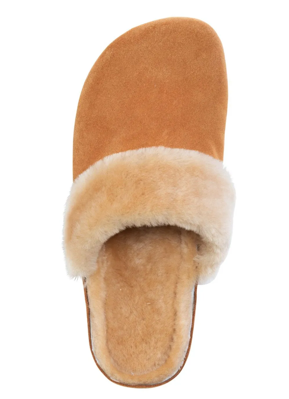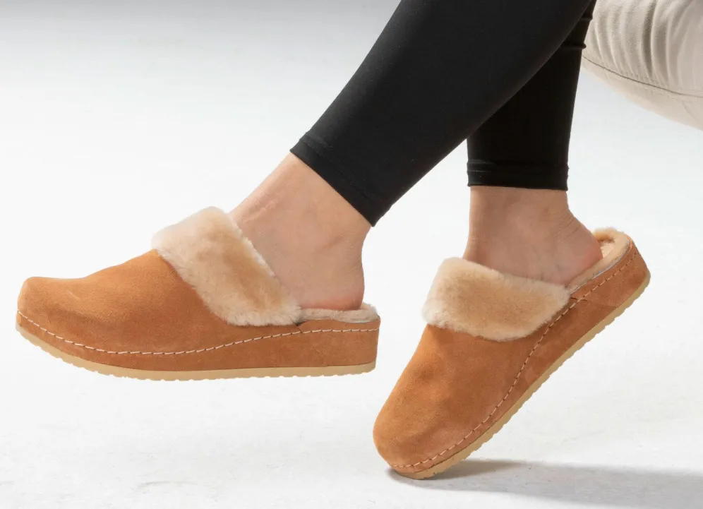 Gemütliche Hausschuhe aus weichem Veloursleder, mit Kragen, Futter und Fußbettbezug aus echtem Lammfell: Weite H, PU-TPR-Laufsohle sowie 15 mm Keilabsatz
