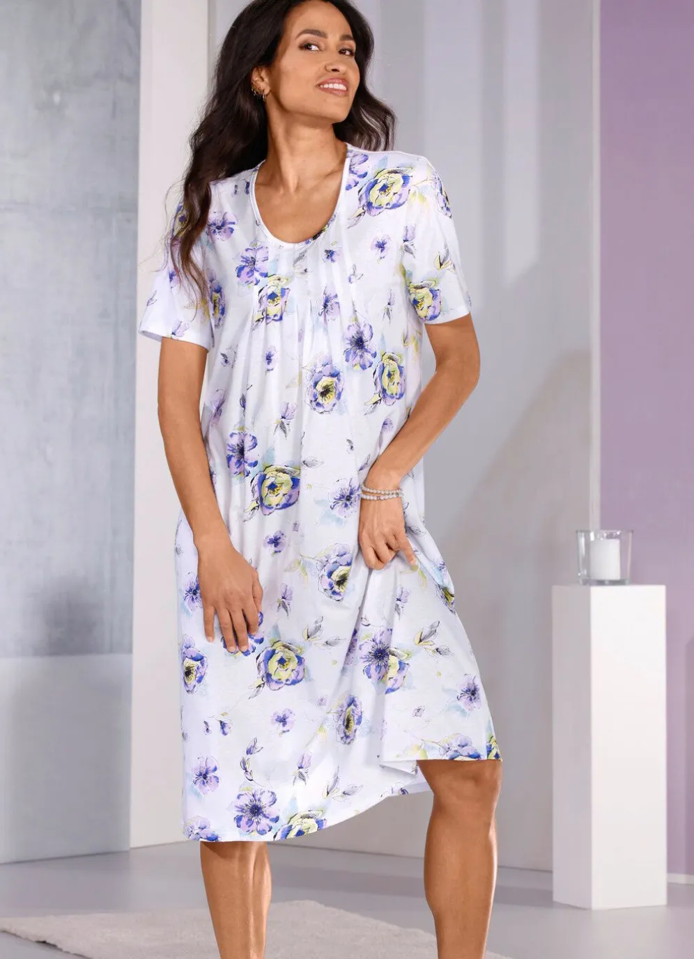 Bezauberndes, knielanges Nachthemd in Weiß-Viola-Bunt: Faltenlegung unterhalb der Absteppung am Dekolleté sowie kurze Ärmel.