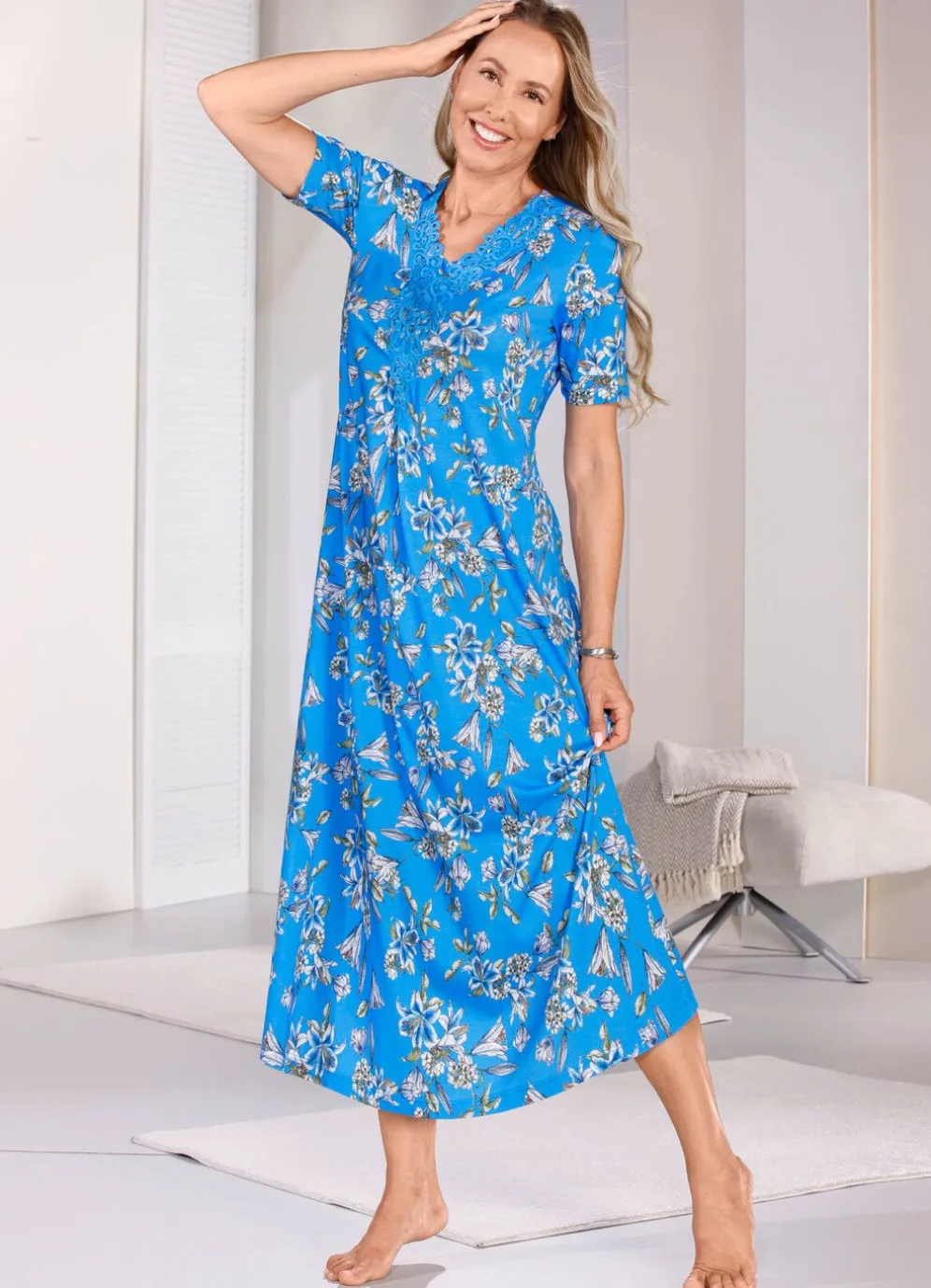 Zauberhaftes, knöchellanges Nachthemd von „Laurina” in Royalblau-Oliv-Bunt, mit großzügiger