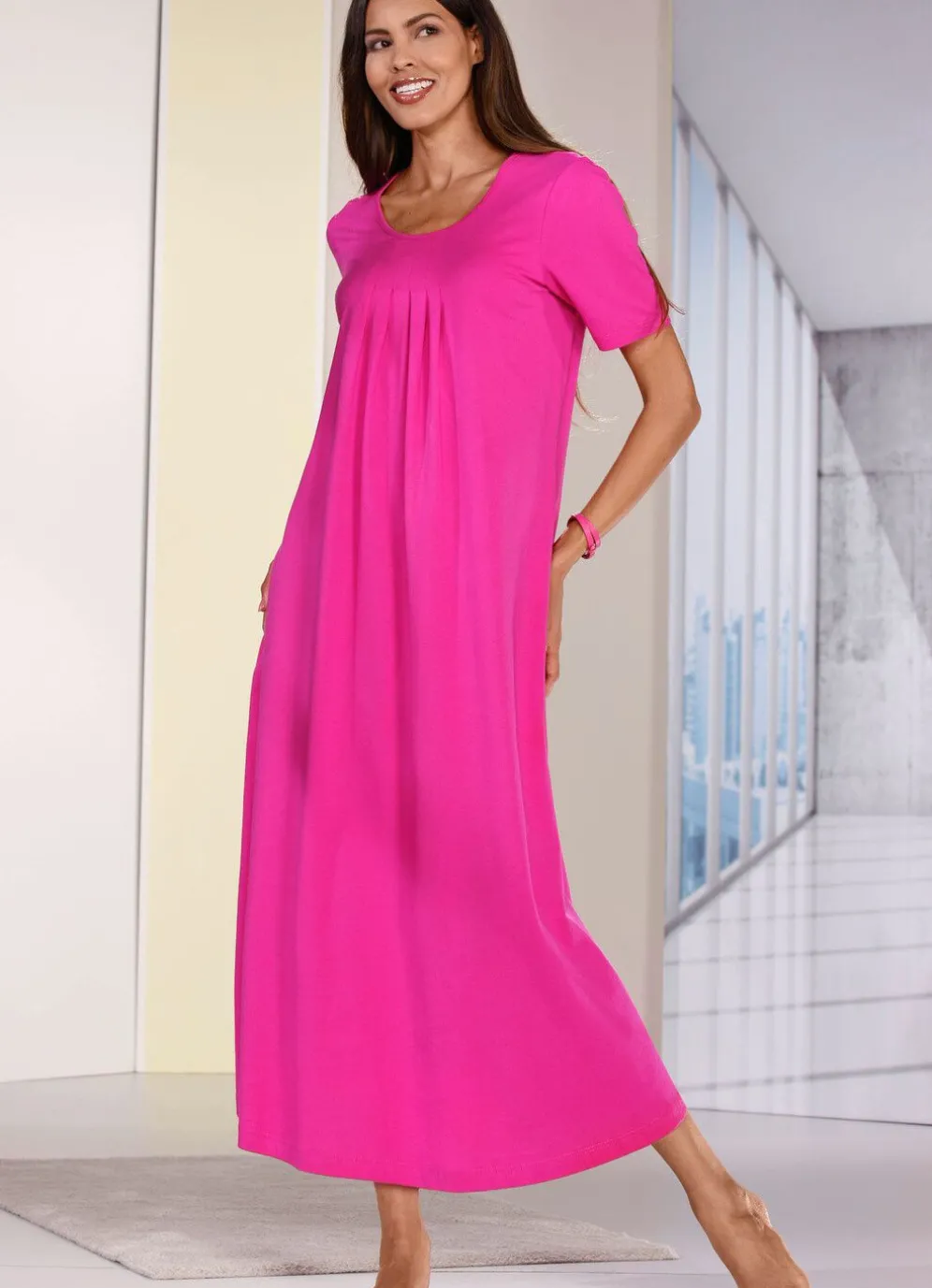 Knöchellanges Nachthemd, mit Faltenlegung unterhalb der Absteppung am Dekolleté sowie kurzen Ärmeln.