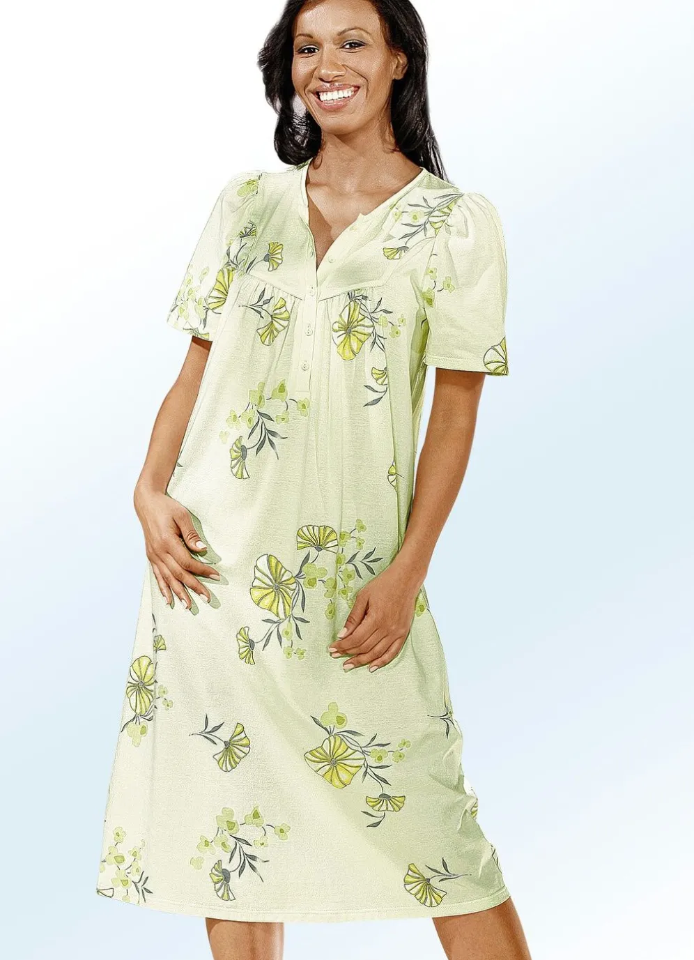 Wadenlanges Nachthemd mit Satinpaspel, Vorderpasse, langer Knopfleiste sowie Raffung vorne und am Ansatz der kurzen Ärmel.