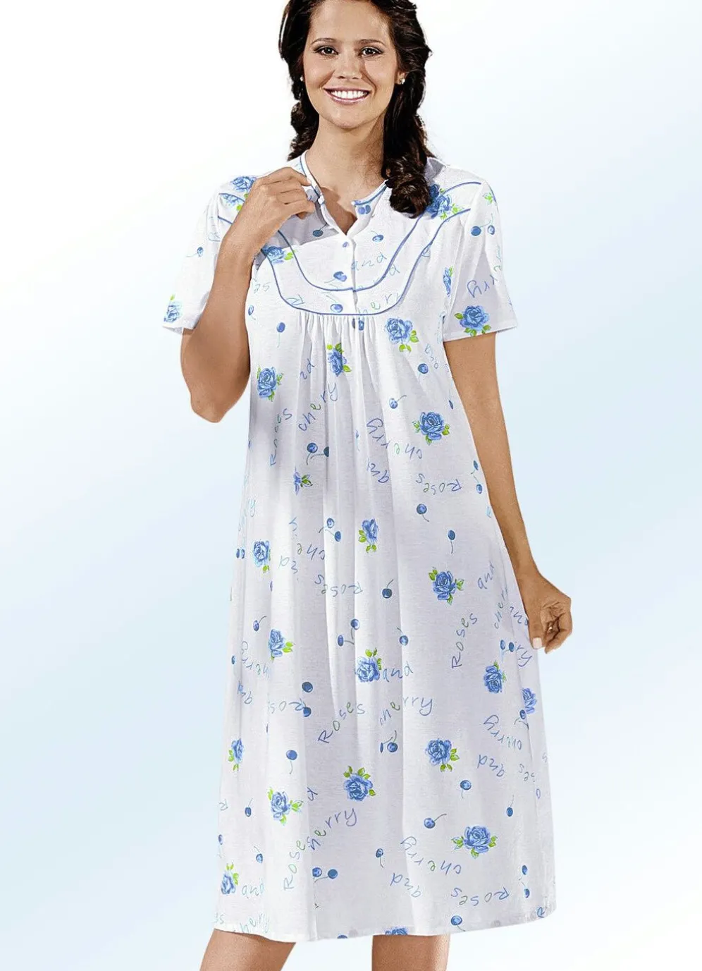 Feminines, wadenlanges Nachthemd mit schönem Alloverdessin, Knopfleiste, Paspelzier am Halsausschnitt und an der Vorderpasse, Raffung vorne und kurzen Ärmeln.