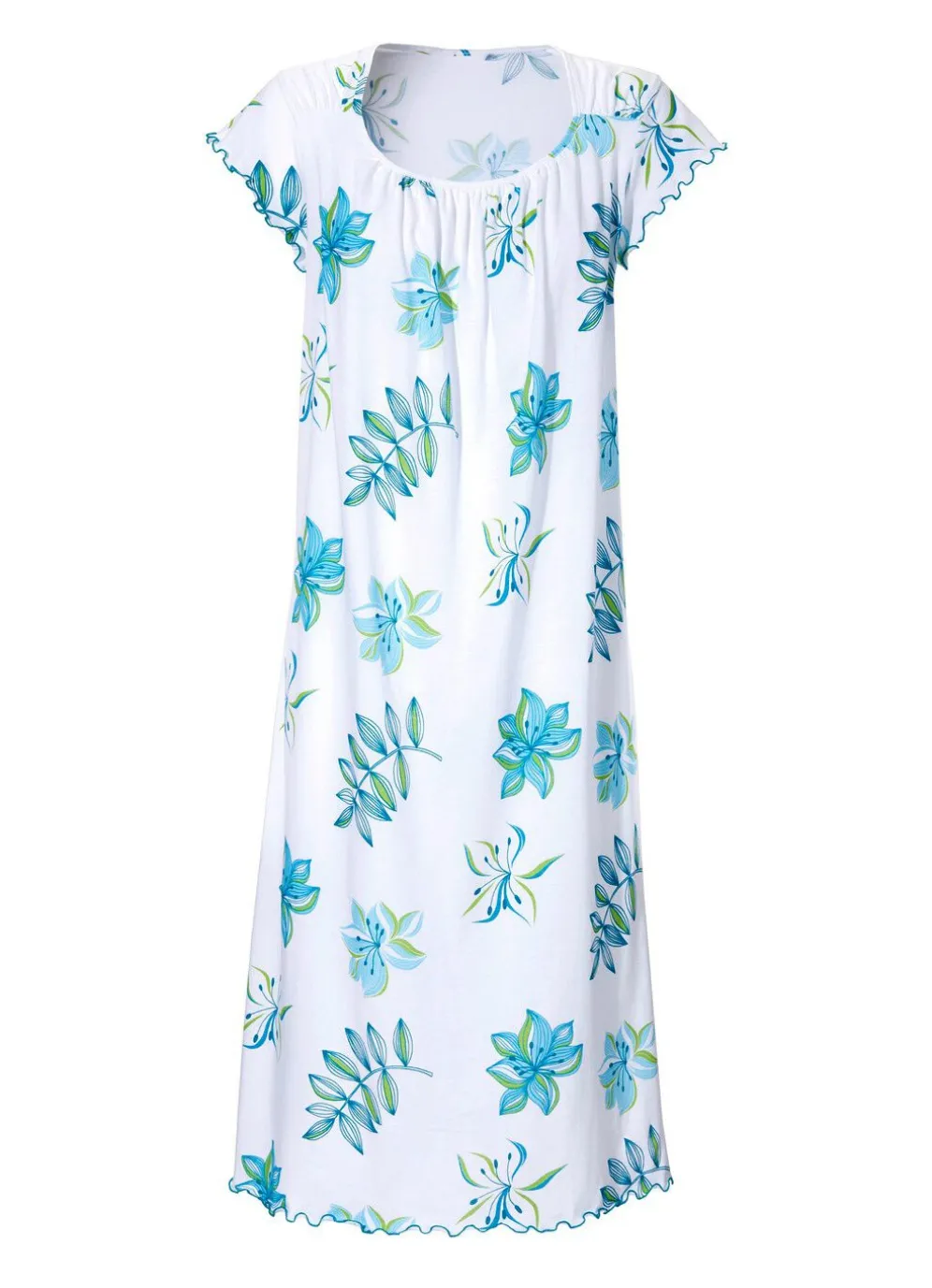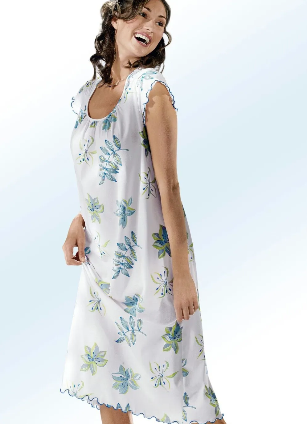Herrlich leichtes, wadenlanges Nachthemd mit Schulterpasse, Raffungen sowie gebogten Abschlüssen an den kurzen Ärmeln und am Saum.