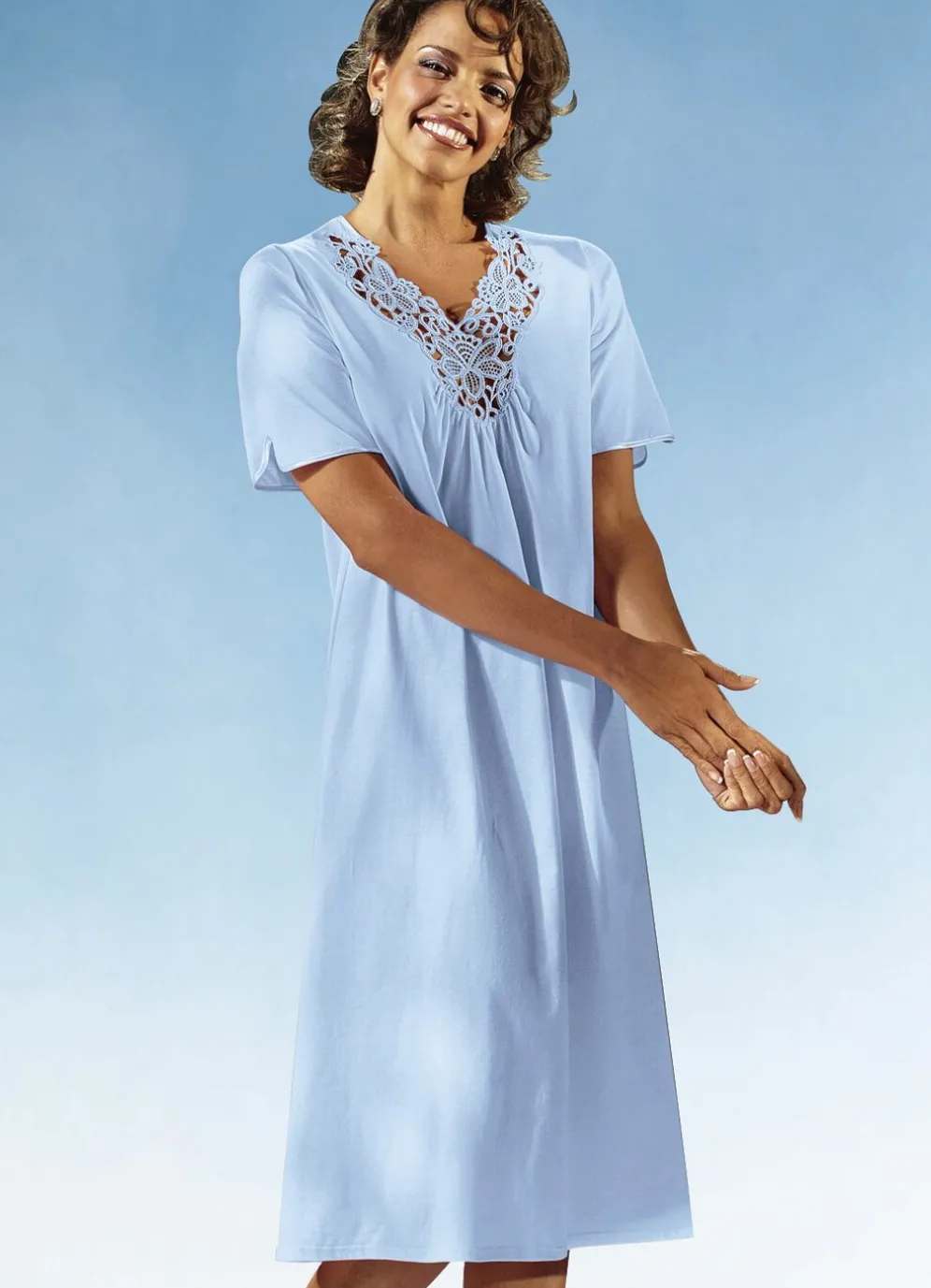 Wunderhübsches, wadenlanges Nachthemd mit großzügiger Stickereimotivspitze am vorderen Dekolleté, Raffung vorne sowie Satinbandeinfassung am hinteren Halsausschnitt und an den abgerundeten Abschlüssen der kurzen Ärmel. Kleine Schlitze mit abgerundeten Saumkanten am Ärmel.