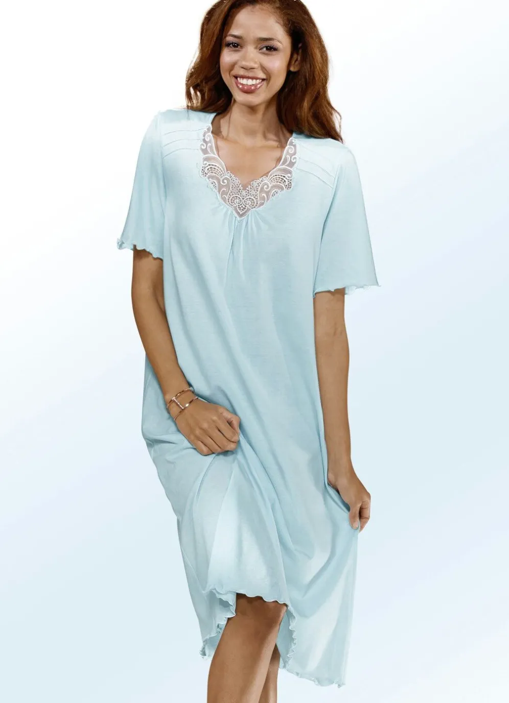 Wer sich in seiner Nachtwäsche richtig wohl fühlt, schläft auch besser – somit treffen Sie mit diesem wadenlangen Nachthemd sicher die richtige Wahl! Mit Tüllstickereispitze am V-Ausschnitt, Biesen und Raffungen vorne sowie gebogten Abschlüssen an den kurzen Ärmeln und am Saum.