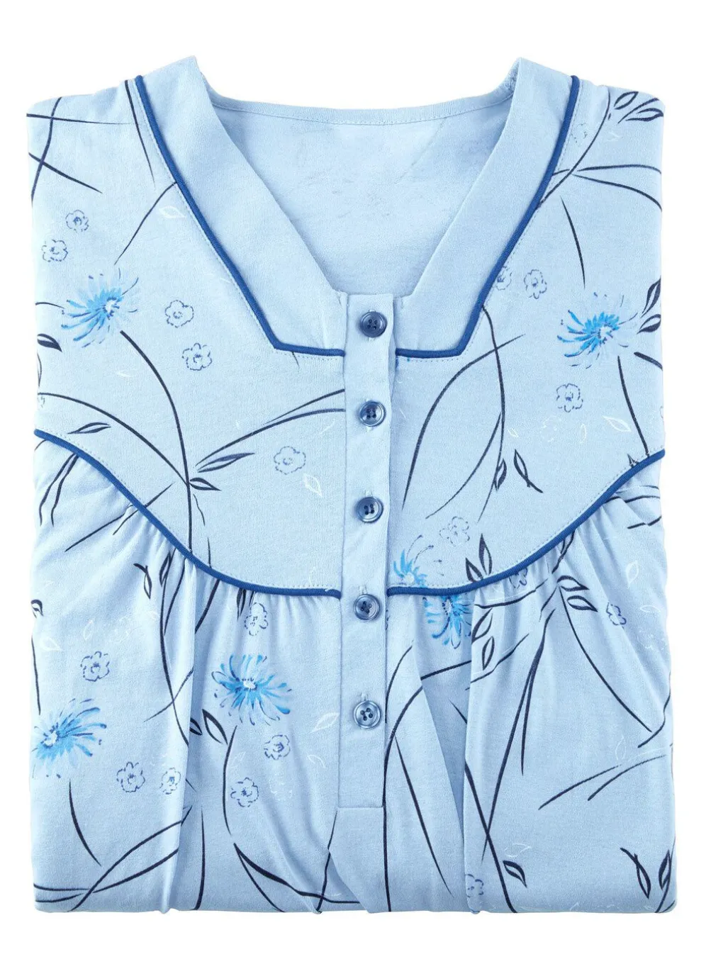 Reizendes Nachthemd in wadenlanger Form, mit Kontrastpaspel an der eckigen Ausschnittblende und der Vorderpasse, langer Knopfleiste, Raffung vorne sowie am Ansatz der langen Ärmel.