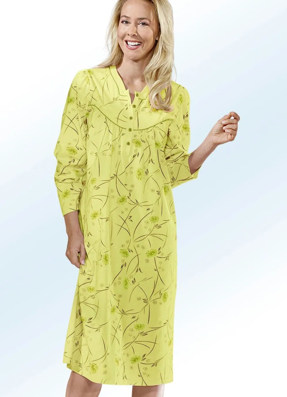 Reizendes Nachthemd in wadenlanger Form, mit Kontrastpaspel an der eckigen Ausschnittblende und der Vorderpasse, langer Knopfleiste, Raffung vorne sowie am Ansatz der langen Ärmel.