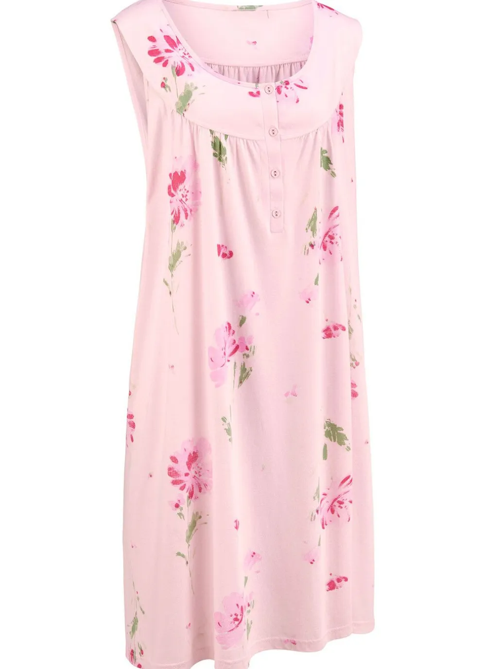 Verspieltes, knielanges Nachthemd in Rosa-Magnolie-Bunt mit Raffungen an der Blende im Vorder- und Rückteil sowie längerer Knopfleiste.