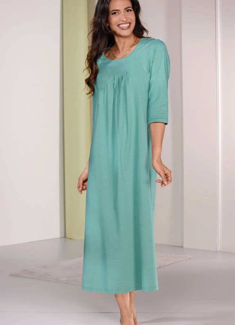 Knöchellanges Nachthemd mit Faltenlegung unterhalb der Absteppung am Dekolleté sowie 3/4-langen Ärmeln.