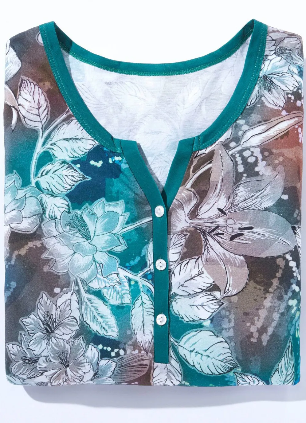 Traumhaftes, knielanges Nachthemd mit farbbrillantem Druckdessin, Einfassungen, Knopfleiste, 3/4 langen Ärmeln sowie abgerundetem Saum.
