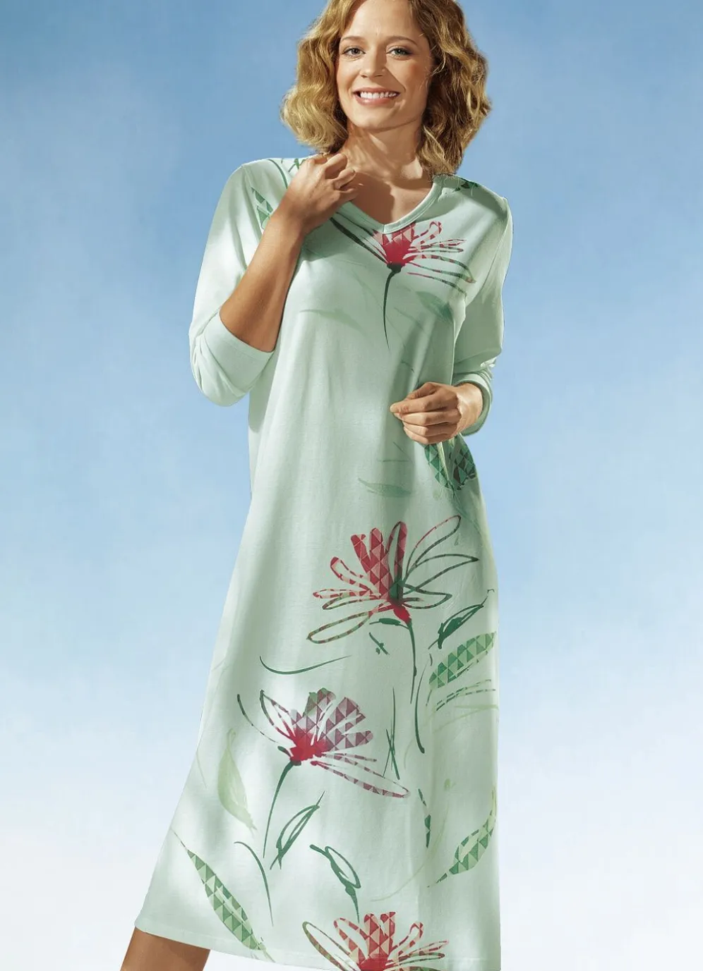 Der im Vorderteil dieses wadenlangen Nachthemds zu sehende, florale Bordürendruck verwandelt dieses Modell in etwas ganz Besonderes! Mit Einfassungen am V-Ausschnitt und an den Abschlüssen der langen Ärmel.