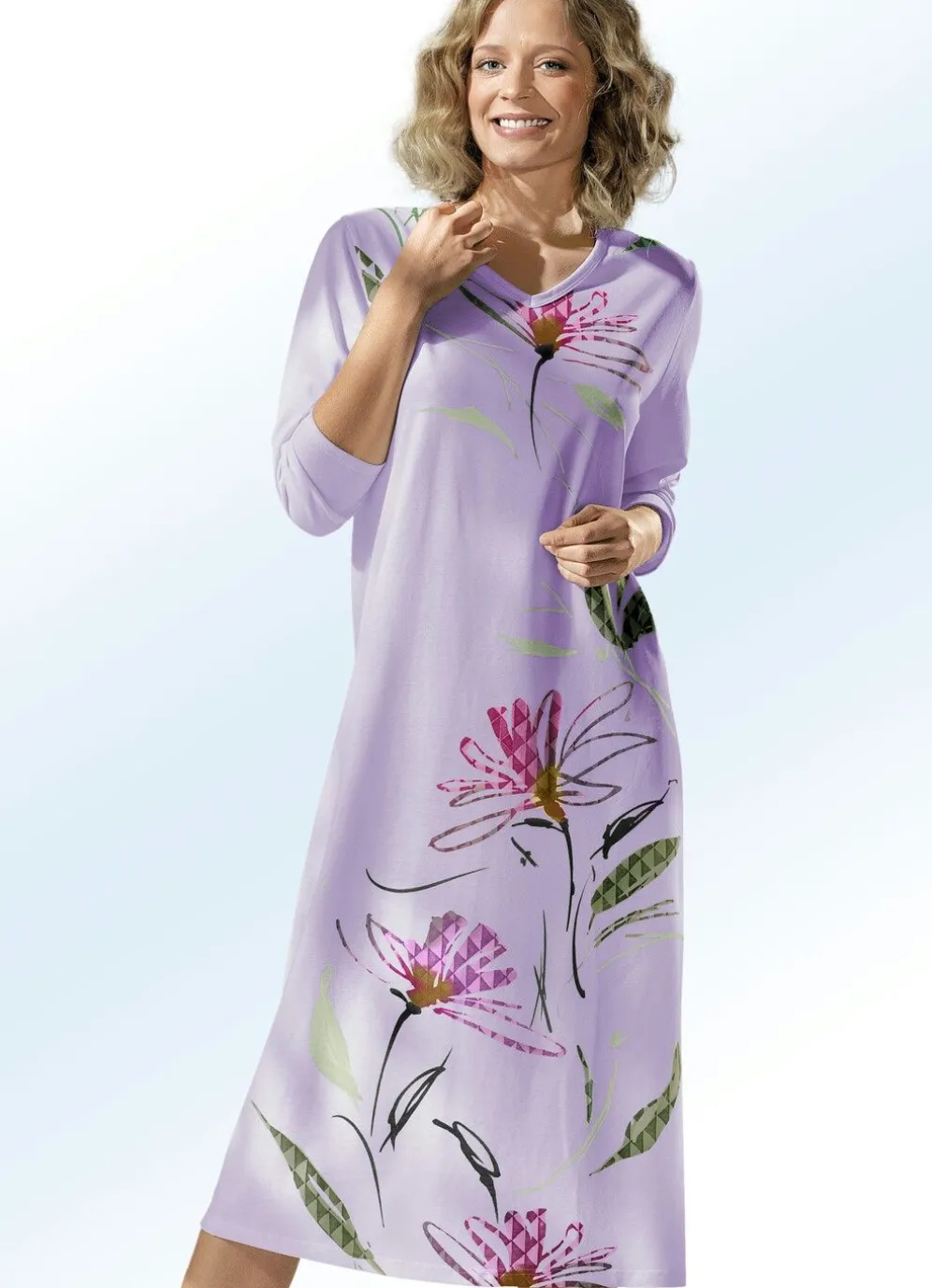Der im Vorderteil dieses wadenlangen Nachthemds zu sehende, florale Bordürendruck verwandelt dieses Modell in etwas ganz Besonderes! Mit Einfassungen am V-Ausschnitt und an den Abschlüssen der langen Ärmel.