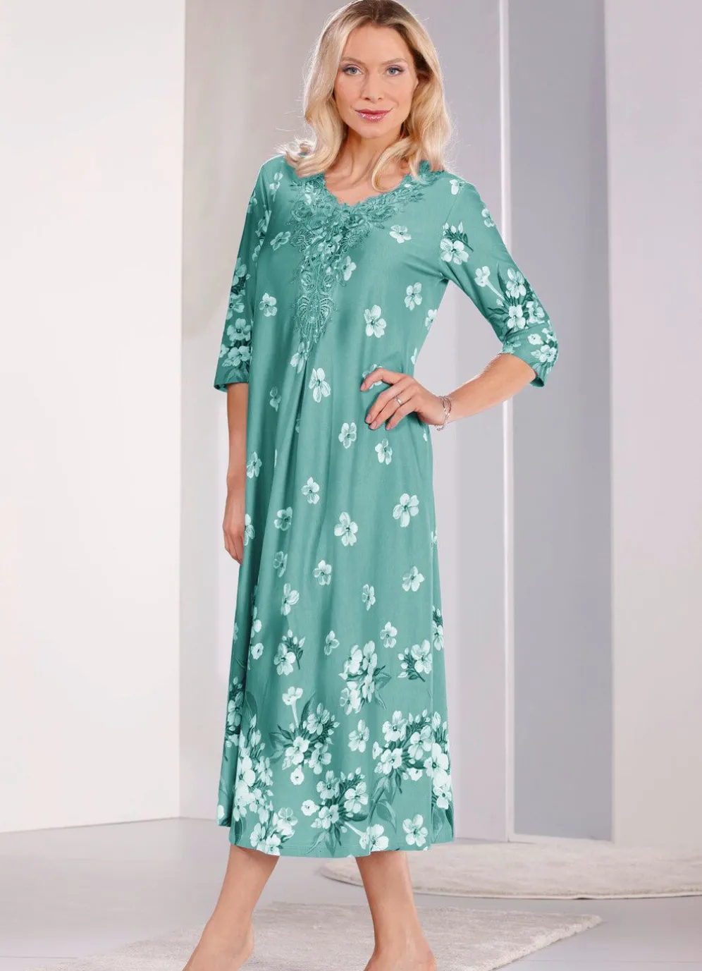 Schönes knöchellanges „Laurina”-Nachthemd mit floralem, buntem Bordürendruck. Großzügige Motivspitze und Kellerfalte im Vorderteil sowie 3/4-lange Ärmeln.