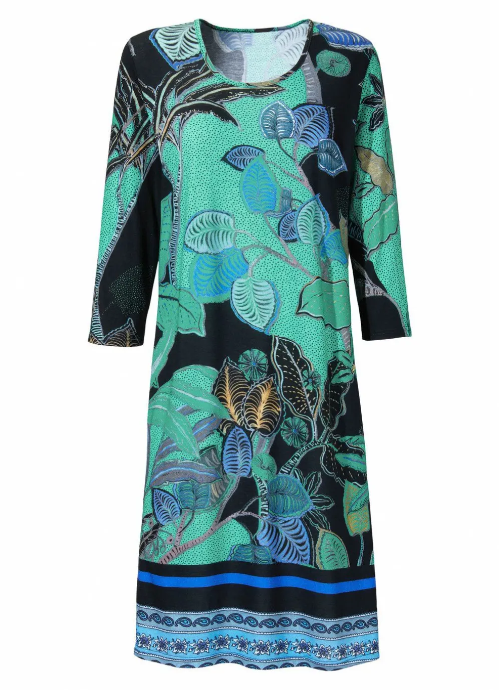 Faszinierendes, knielanges Nachthemd von „Laurina“, mit farbbrillantem Bordürendruck in Schwarz-Grün-Bunt sowie 3/4-langen Ärmeln.