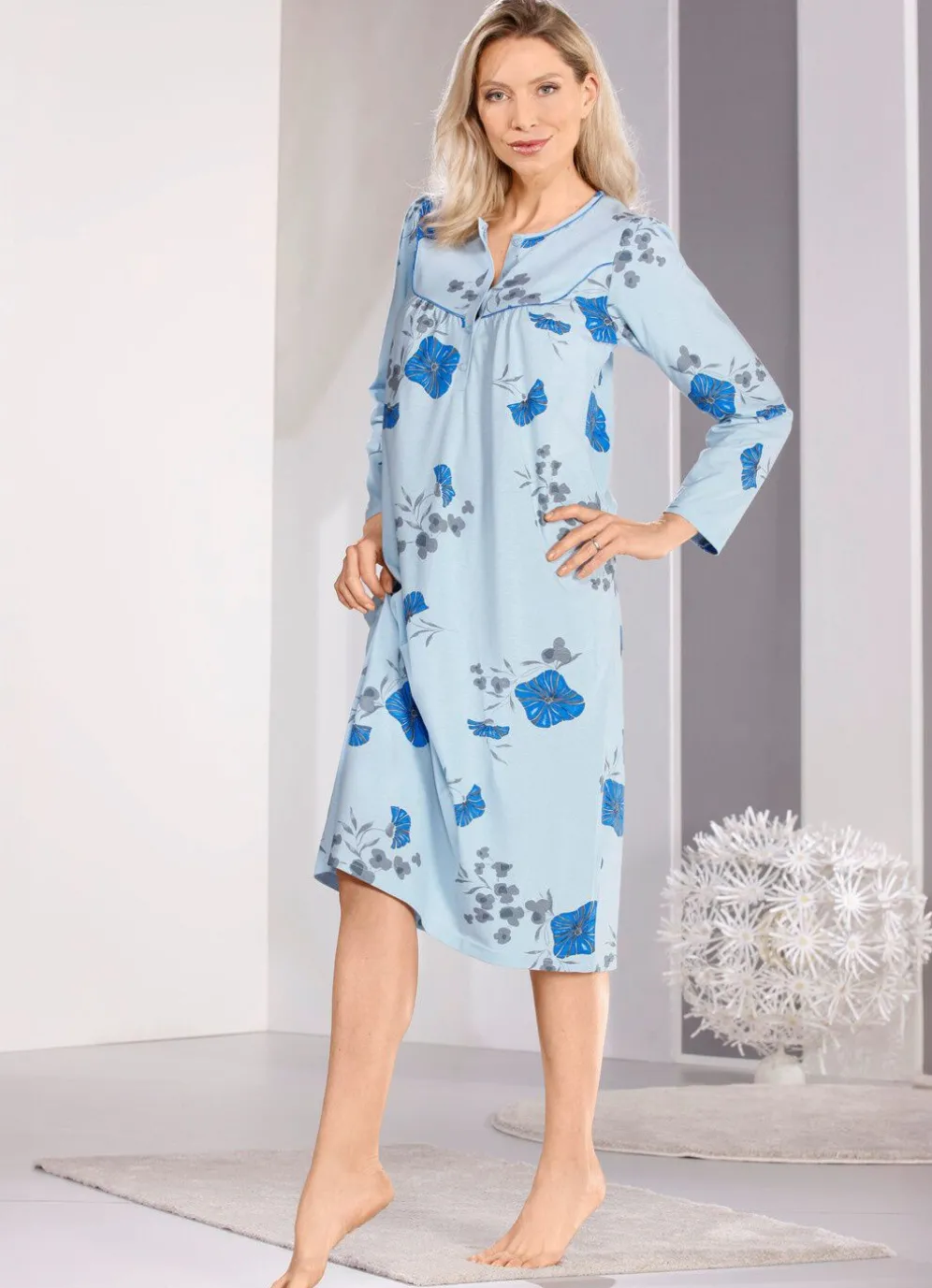 Wadenlanges Nachthemd in Blau-Grau, mit Satinpaspel am Halsausschnitt rundum und an der