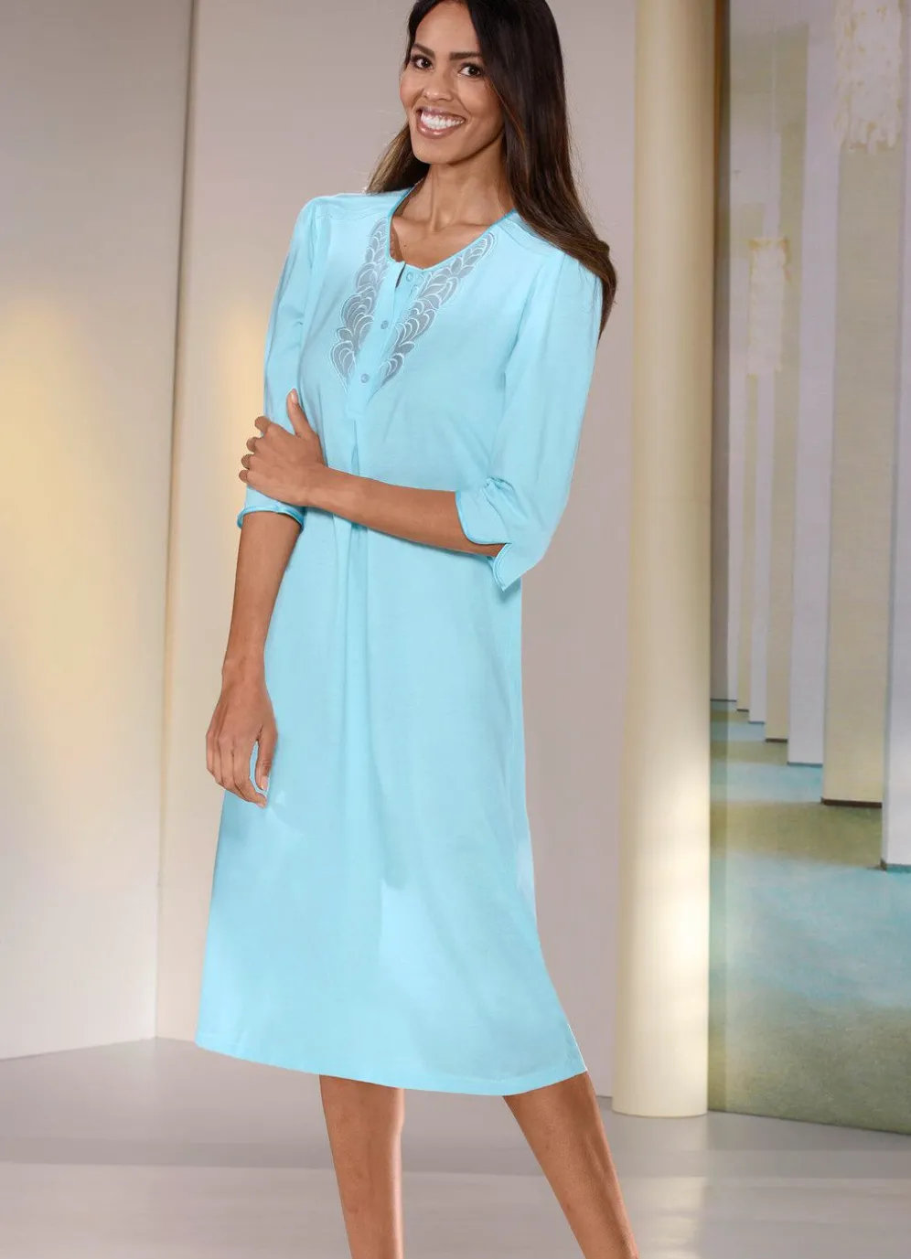 Wadenlanges Nachthemd mit Biesen, Raffungen, Satineinfassungen, transparenter Tüllstickereispitze entlang der Knopfleiste, Kellerfalte vorne sowie 3/4-langen Ärmeln mit abgerundetem Schlitz.