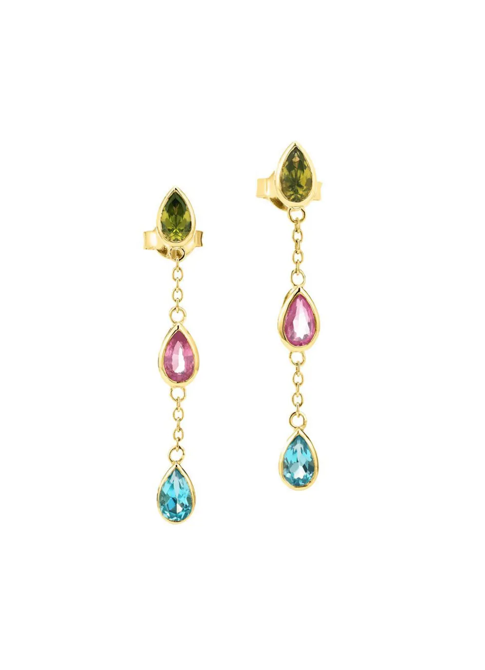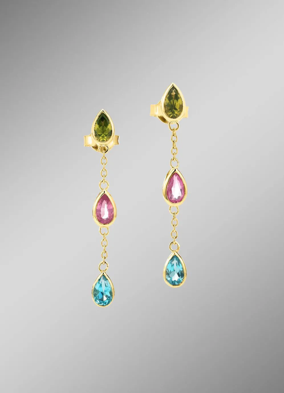 Diese stilvollen Ohrstecker aus 375/- Gold 375/- fein vereinen edle Materialien mit einem harmonischen Farbspiel. Ein beh.Blautopas, echter Peridot und ein pinkfarbener Safir setzen leuchtende Akzente und verleihen dem Design eine frische, feminine Ausstrahlung. Mit einer Länge von 31 mm wirken die Stecker elegant und leicht, schwingen sanft mit jeder Bewegung und bringen die Farbkraft der Edelsteine besonders schön zur Geltung. Ein ausdrucksstarkes Schmuckstück, das jedem Look eine edle, farbenfrohe Note verleiht.