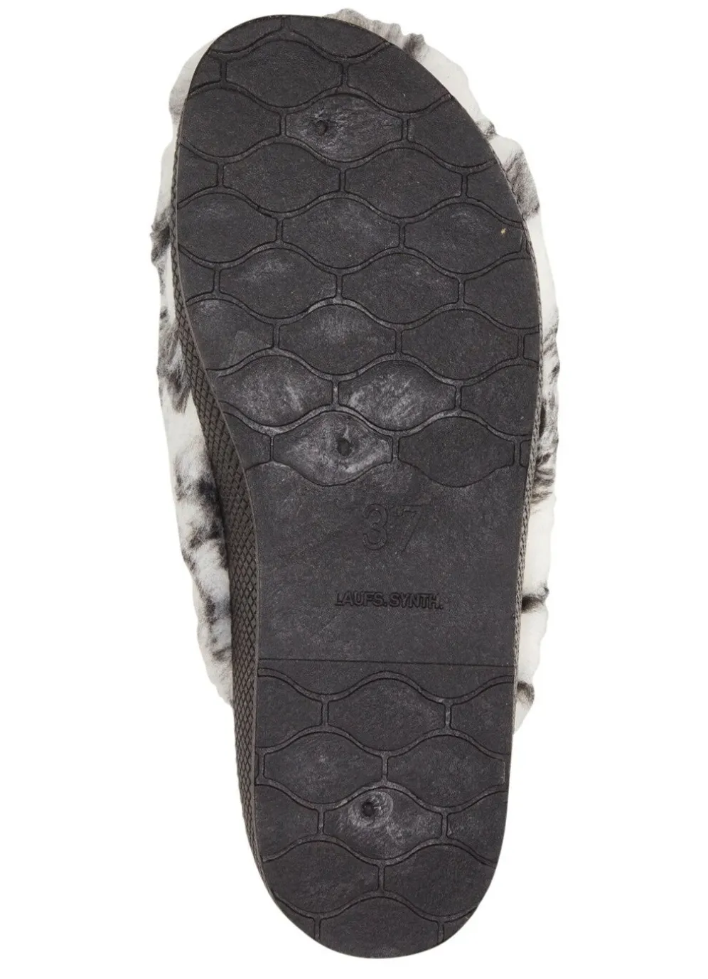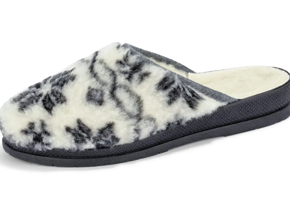 Pantoffel aus bedrucktem Plüschmaterial: Warmfutter und Fußbettbezug aus 100% Schurwolle, PVC-Laufsohle sowie 20 mm Keilabsatz