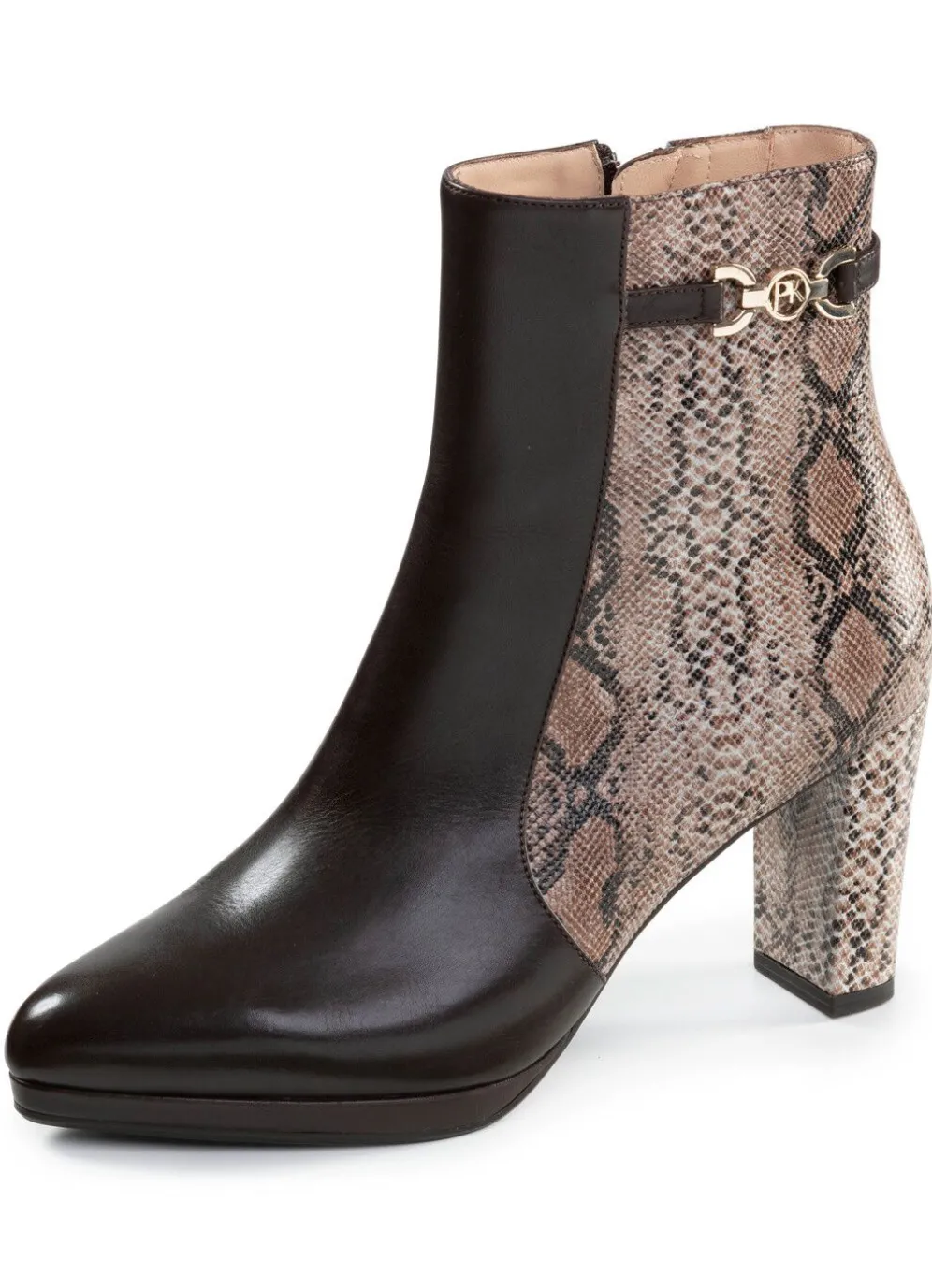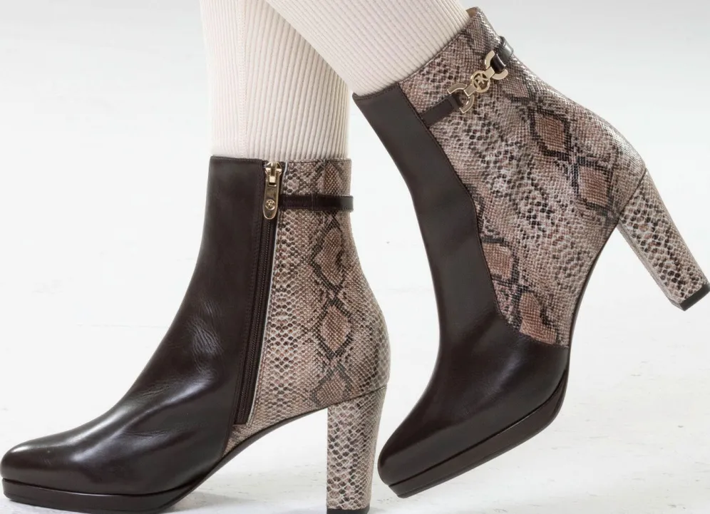 Rassige Stiefeletten aus teilweise reptilgeprägtem Nappaleder mit Schmuckteil und Innenreißverschluss: Lederfutter, gepolsterte Lederdecksohle, leichte TPU-Laufsohle sowie lederbezogener 70 mm Absatz. Schafthöhe ca. 16 cm