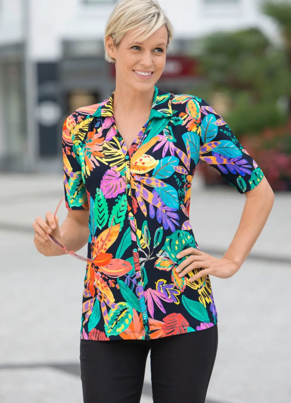 Jedes Teil ein Unikat! Hinreißendes Poloshirt mit farbbrillantem Allover-Druck in Multicolor, V-Ausschnitt sowie durchgehender Zierknopfleiste im Vorderteil.