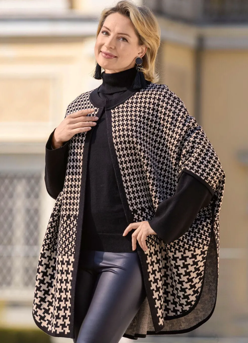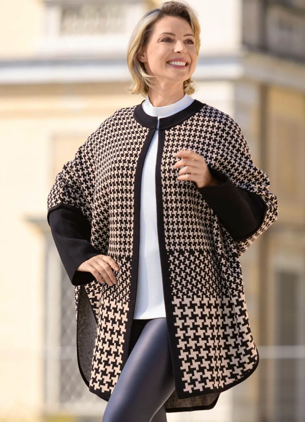 Interessanter Poncho von laurakent in offener Form, mit grafischem Jacquardmuster in Schwarz-Creme allover, Häkchenverschluss am runden Halsausschnitt, etwas weiteren, langen Fledermausärmeln, hohen Seitenschlitzen sowie Kontrastabschlüssen.