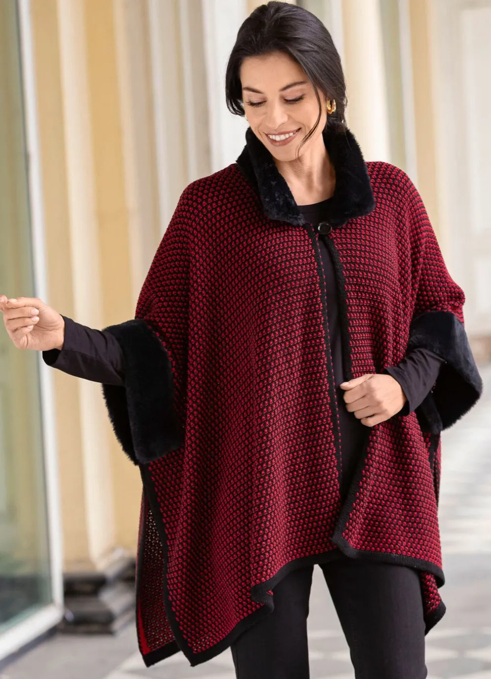 Ein Lieblingsstück mit viel Raffinesse ist dieser schwarz-rote Poncho mit Kunstpelz-Kragen, 1-Knopfverschluss, Strukturstrick allover, Kunstpelz-Besatz an den Armausschnitten sowie Kontrastabschlüssen an den fixierten offenen Seiten und am Saum.