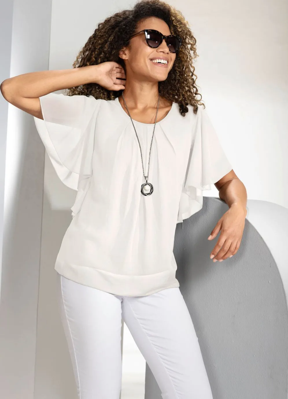 Große Klasse ist diese Poncho-Tunika mit eingearbeitetem Top, rundem Halsausschnitt, weiten Fledermausärmeln sowie toller Fältelung im Vorderteil und an der Rückenpasse.