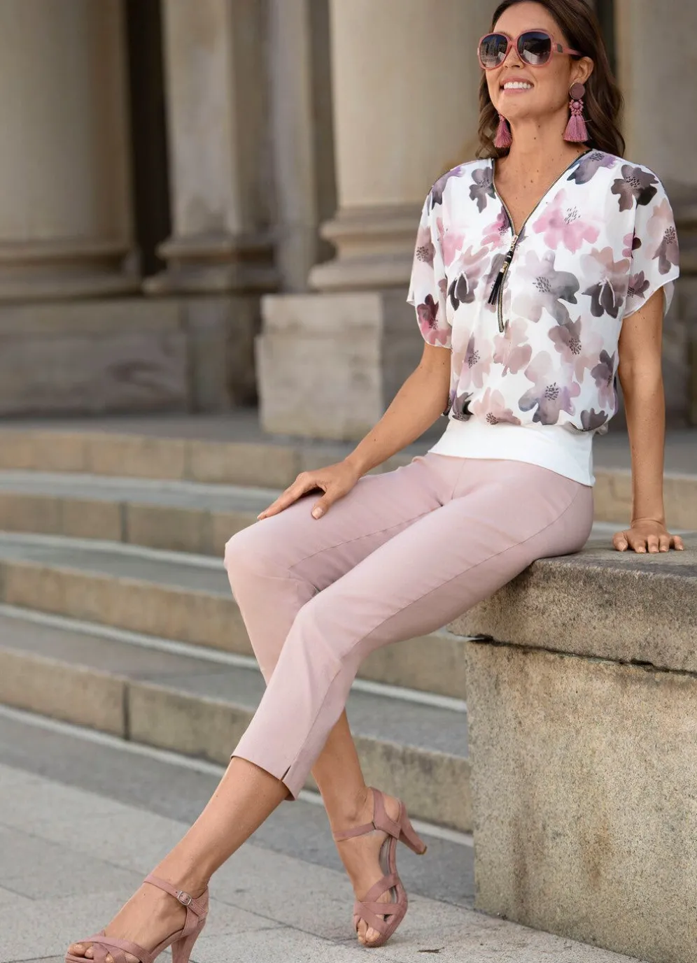 Flotte Poncho-Tunika in Ecru-Rosenholz-Taupe-Bunt, mit eingearbeitetem Top, dekorativem Schmuckanhänger am V-Ausschnitt, kurzem Reißverschluss sowie breitem Jersey-Bund rundum.