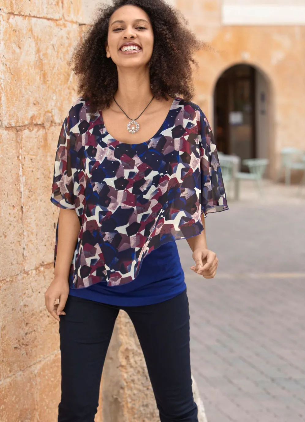 Poncho-Tunika mit farbbrillantem Druck in Royalblau-Marine-Bordeaux-Bunt, rundem Halsausschnitt, kurzen, überschnittenen Ärmeln sowie asymmetrischem Poncho-Besatz im Vorder- und Rückteil mit glänzenden Schmucksteinen.