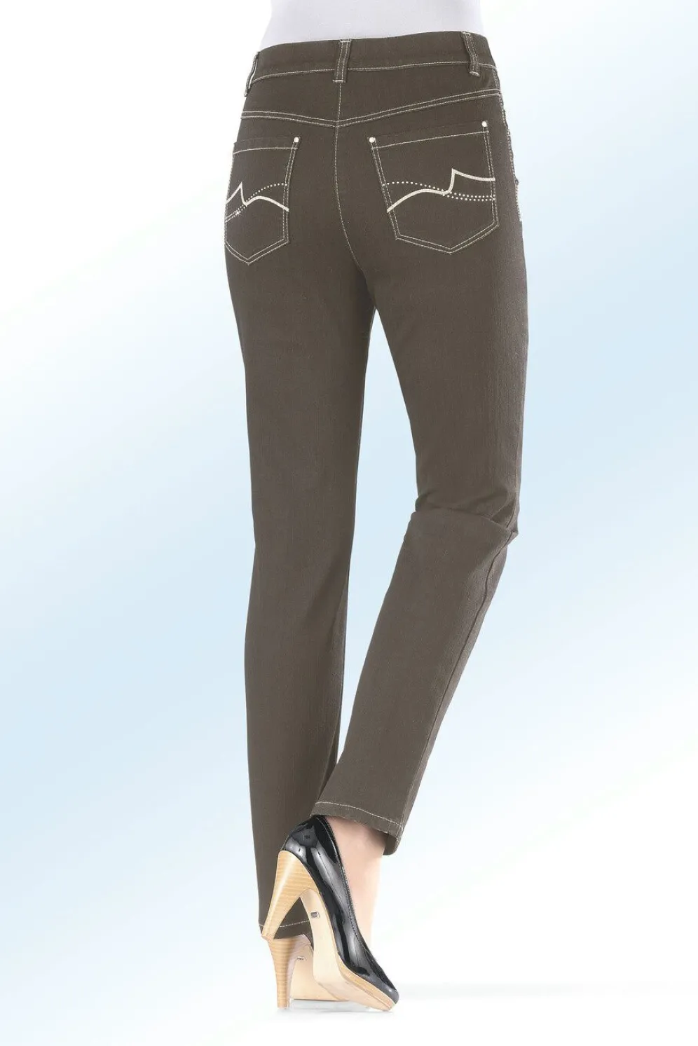 Der Clou bei dieser hochelastischen Power-Stretch-Jeans mit hoher Elastizität und exzellentem Rücksprungverhalten sowie toller Passform ist der superbequeme, glatt anliegende und unsichtbare „Zauberbund“ mit bis zu 8 cm Dehnreserve: 5-Pocket-Form, Knopf- und Reißverschluss, Gürtelschlaufen, schöne, kontrastfarbene Stickerei verziert mit Strasssteinen sowie Ziernieten an den Gesäßtaschen. Innenbeinlänge ca. 79 cm, Fußweite ab 34 cm.