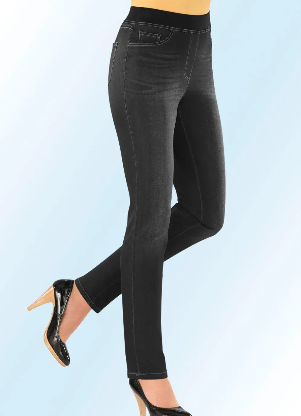 Power-Stretch-Jeans mit exzellentem Rücksprungverhalten: bequeme Schlupfform, super softer, formbeständiger Rundum-Dehnbund aus Jersey Qualität, angedeutete Reißverschluss-Zierblende, Ziersteppungen in Seitentaschen-Optik sowie Kleingeldtasche, aufgesetzte Gesäßtaschen, Jeanssattel sowie denzente Used-Effekte vorne. Innenbeinlänge ca. 78 cm, Fußweite ab 32 cm.