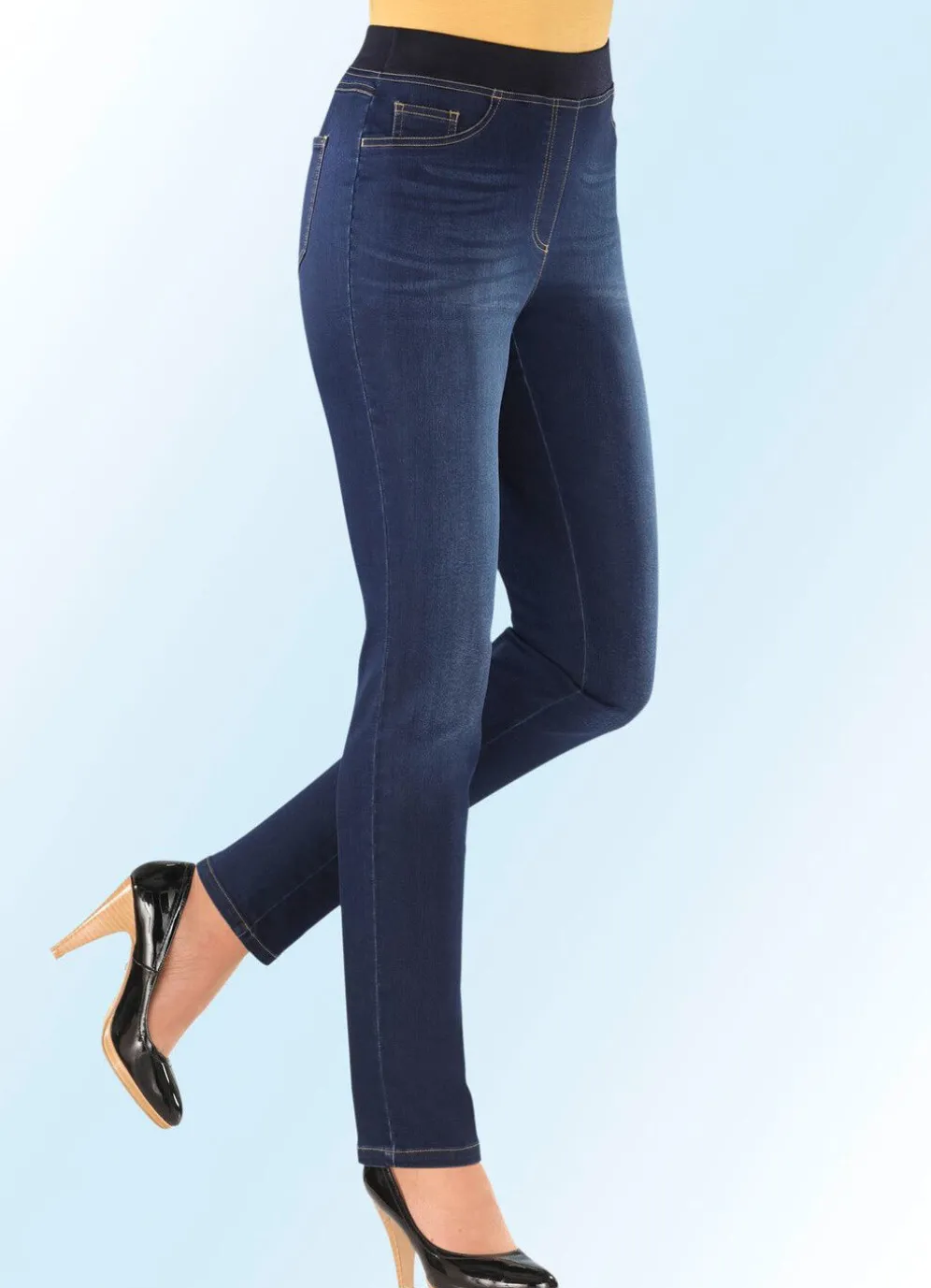 Power-Stretch-Jeans mit exzellentem Rücksprungverhalten: bequeme Schlupfform, super softer, formbeständiger Rundum-Dehnbund aus Jersey Qualität, angedeutete Reißverschluss-Zierblende, Ziersteppungen in Seitentaschen-Optik sowie Kleingeldtasche, aufgesetzte Gesäßtaschen, Jeanssattel sowie denzente Used-Effekte vorne. Innenbeinlänge ca. 78 cm, Fußweite ab 32 cm.
