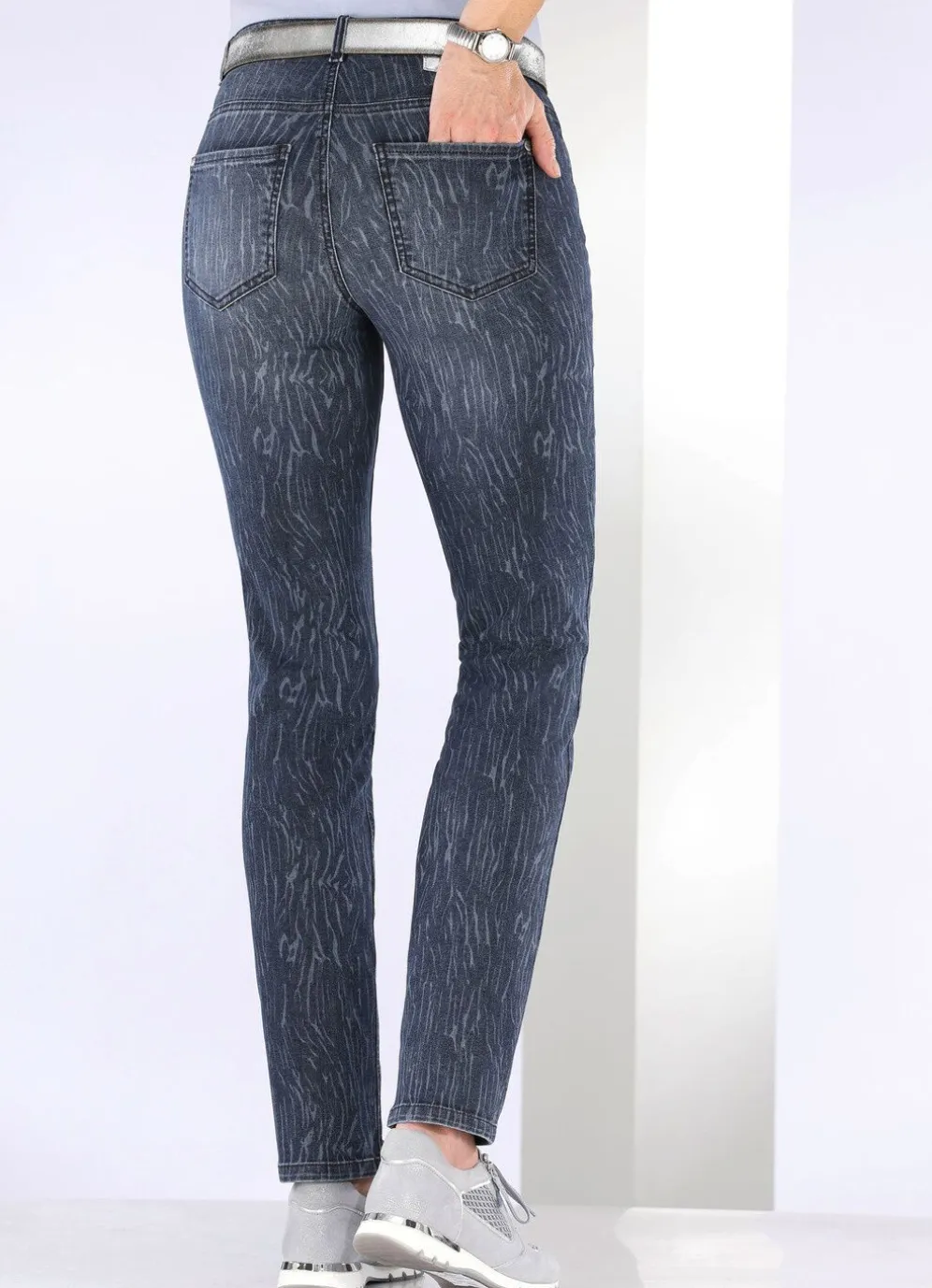 Ausdrucksstark dessinierte Jeans, welche durch die spezielle Laser-Print-Technik zu einem modischen Highlight wird! 4-Pocket-Form, elastischer Bund, Gürtelschlaufen, Knopf- und Reißverschluss, Ziernieten an allen Taschen, Jeanssattel sowie dezente Used-Effekte allover. Die Modischen Waschungen garantieren eine tolle Optik! Innenbeinlänge ca. 77 cm, Fußweite ab 32 cm.