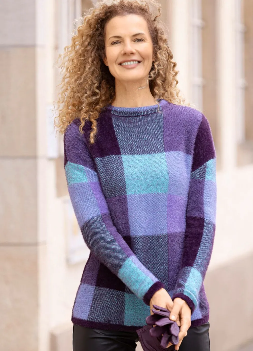 Jedes Teil ein Unikat! Ein Kuschelfavorit mit flauschig weichem Griff ist dieser Pullover in Lila-Flieder-Türkis, schmalem Stehbund, überschnittener Schulterpartie, langen Ärmeln, extravagantem Jacquard-Dessin allover sowie leichtem Glanzeffekt.