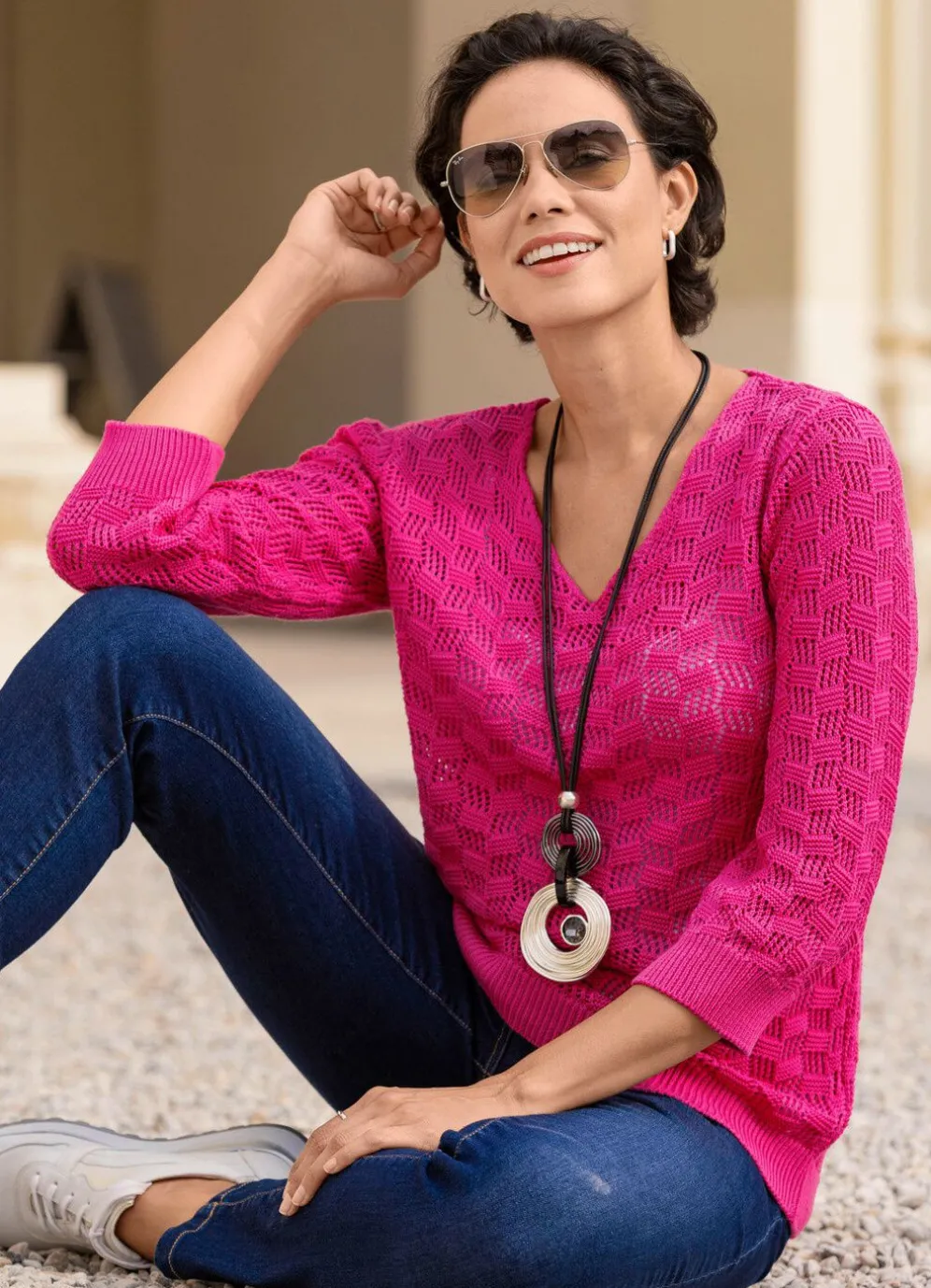 Modischer Pullover in Pink, mit V-Ausschnitt, ausgefallenem Struktur- und Ajourmustermix allover sowie Rippenbund an den 3/4-langen Ärmeln und am Saum.