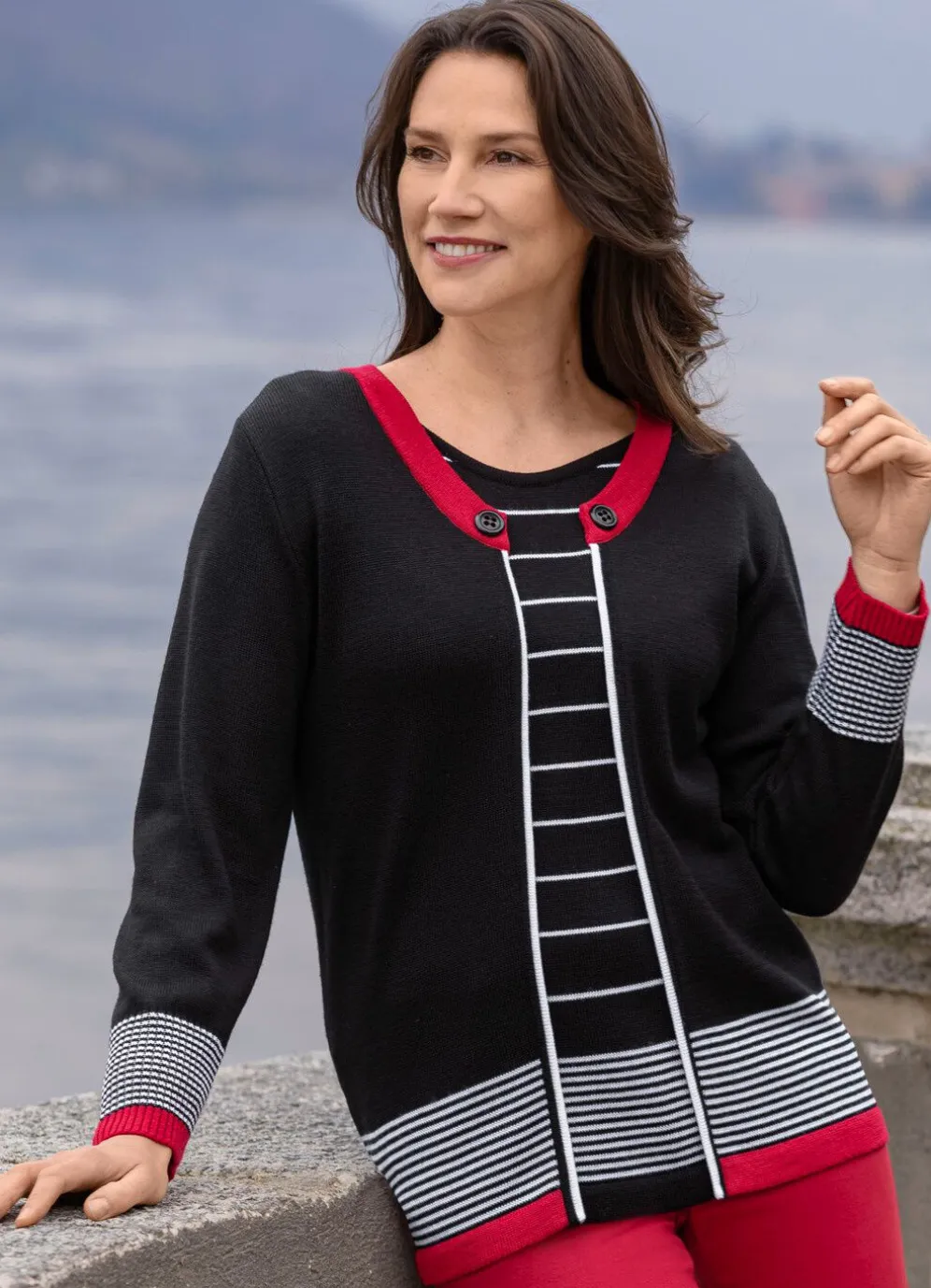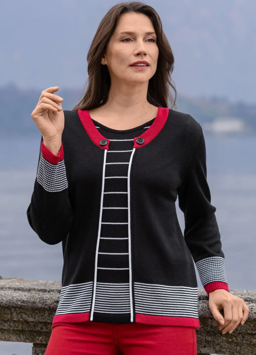 Schwarz-rot-weißer Pullover in Doppel-Optik: unterlegter, runder Halsausschnitt mit gestreiftem Einsatz im Vorderteil, Kontrastkragenblende mit Zierknöpfen sowie gestreifte Abschlüsse in Bordürenoptik an den langen Ärmeln und am Saum.