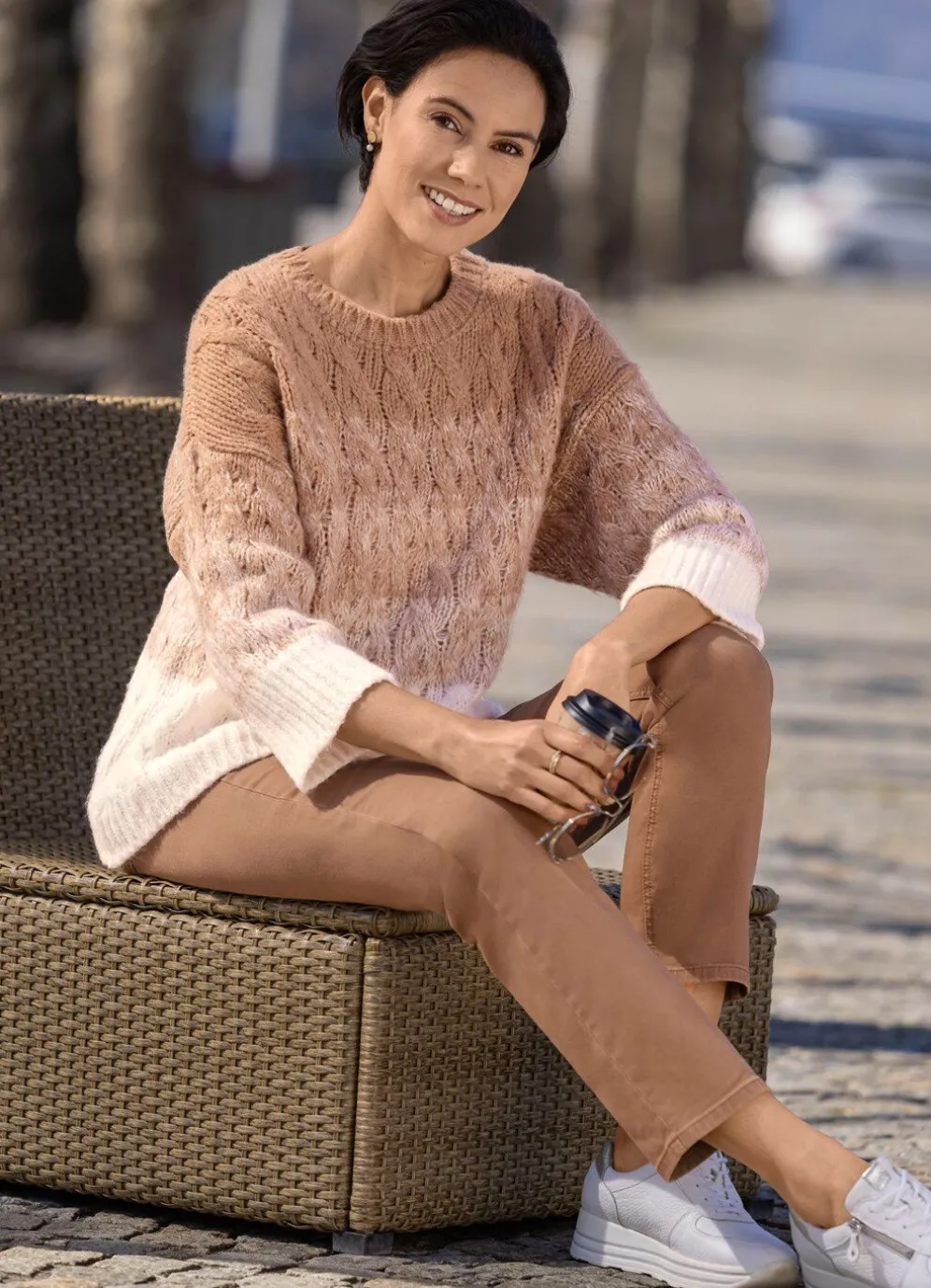 Ein Kuschelfavorit ist dieser Pullover von laurakent in Camel-Ecru: runder Halsausschnitt, überschnittene Schulterpartie, hübsches Strukturmuster im streckenden Zopfdessin und im Farbverlauf allover, etwas weitere Ärmel in modischer Länge, gerippte Abschlüsse.