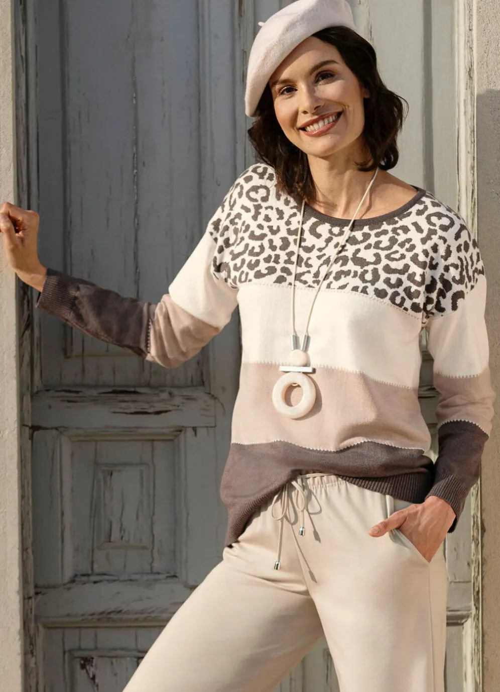 Pullover mit rundem Halsausschnitt, überschnittener Schulterpartie, Blockstreifendessin, Jacquardmuster in Tierfelloptik im oberen Bereich sowie Rippenbündchen an den langen Ärmeln und am Saum.