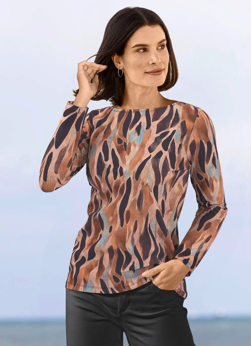 Jedes Teil ein Unikat! Pullover mit flachem Halsausschnitt, farbbrillantem Alloverdruck in Braun-Marine-Multicolor sowie langen Ärmeln.