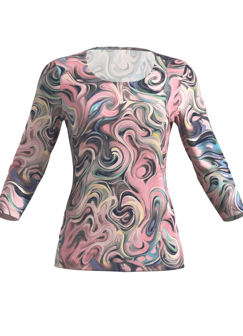 Jedes Teil ein Unikat! Toller Pullover mit rundem Halsausschnitt, farbbrillantem Alloverdruck in Rosa- Schwarz-Multicolor sowie 3/4-langen Ärmeln.