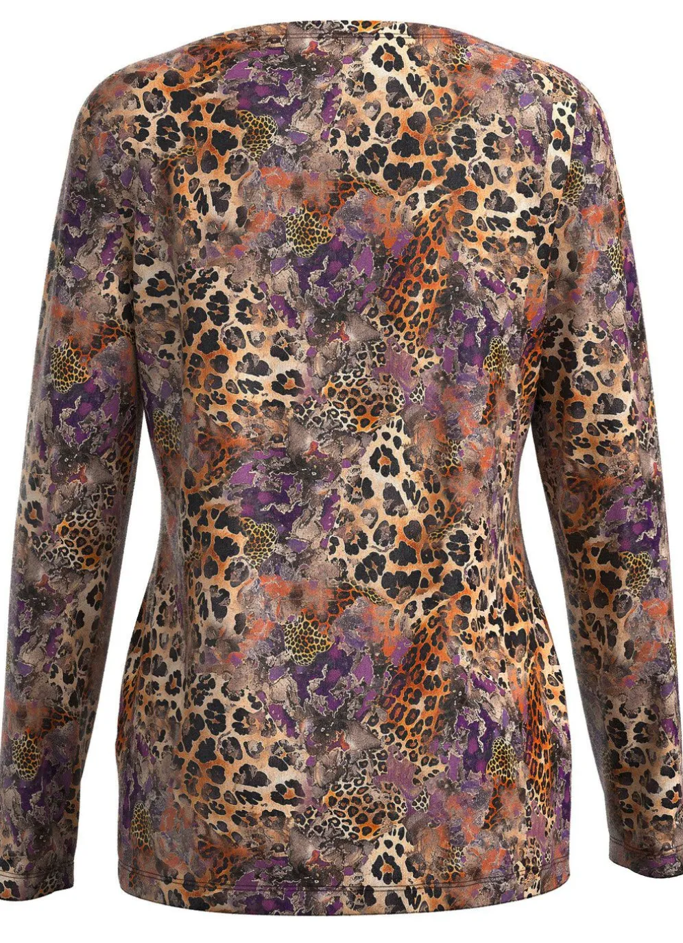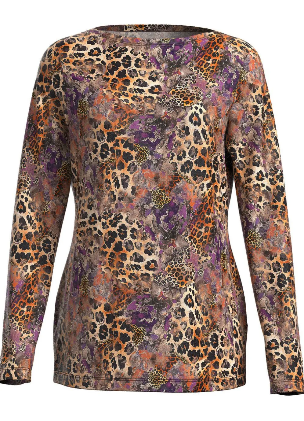 Jedes Teil ein Unikat! Extravaganter Pullover in Beige-Lila-Multicolor, mit modisch flachem Halsausschnitt, farbbrillantem Alloverdruck im Tierfelldessin sowie langen Ärmeln.
