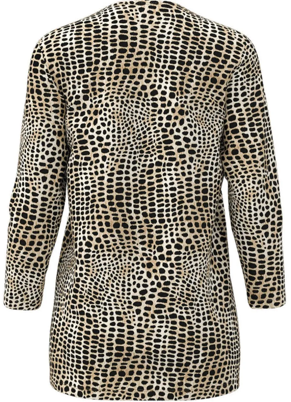 Jedes Teil ein Unikat! Toller Pullover in Beige-Schwarz, mit abgerundetem, legerem V-Ausschnitt, farbbrillantem Alloverdruck im Tierfelldessin sowie 3/4-langen Ärmeln.