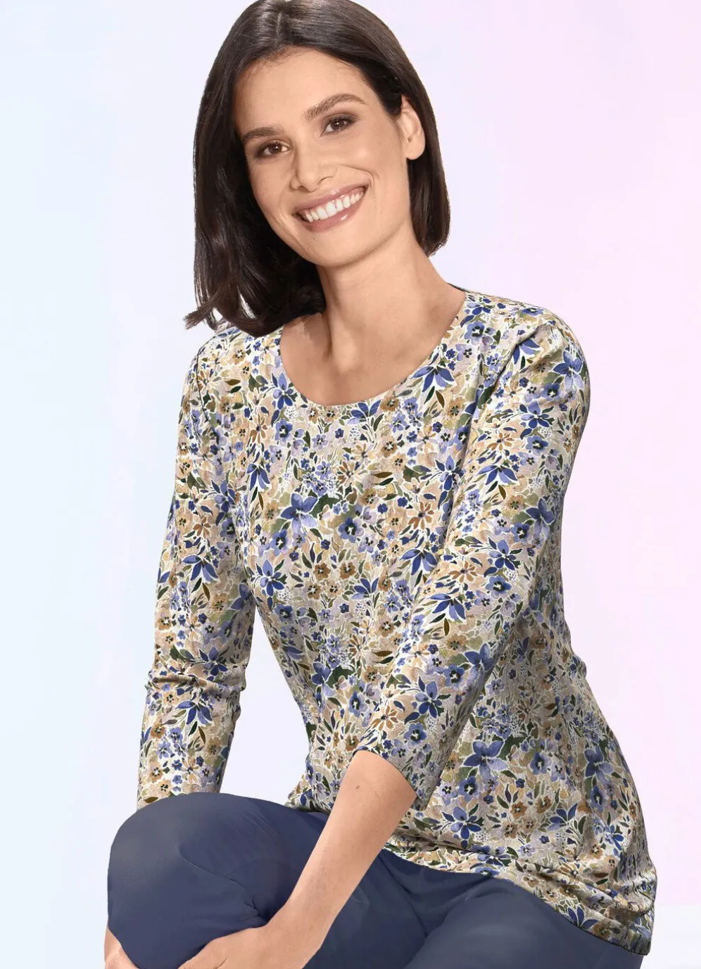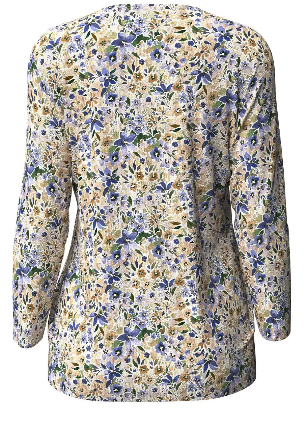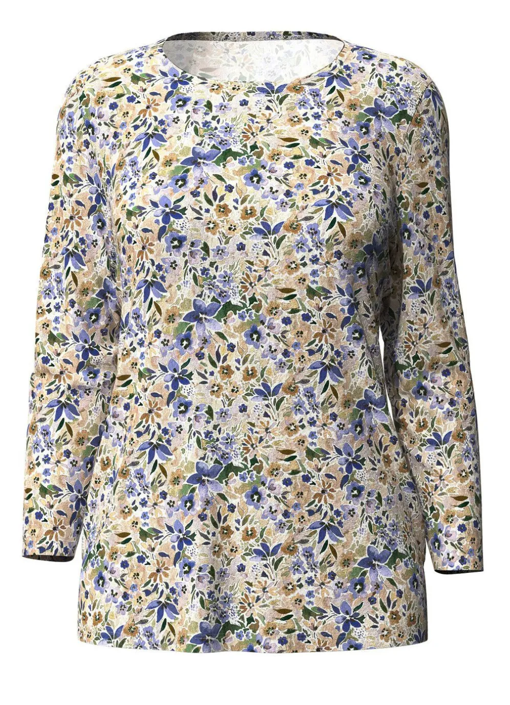 Jedes Teil ein Unikat! Pullover mit floralem, farbbrillantem Alloverdruck in Beige-Blau-Multicolor, rundem Halsausschnitt sowie 3/4-langen Ärmeln.