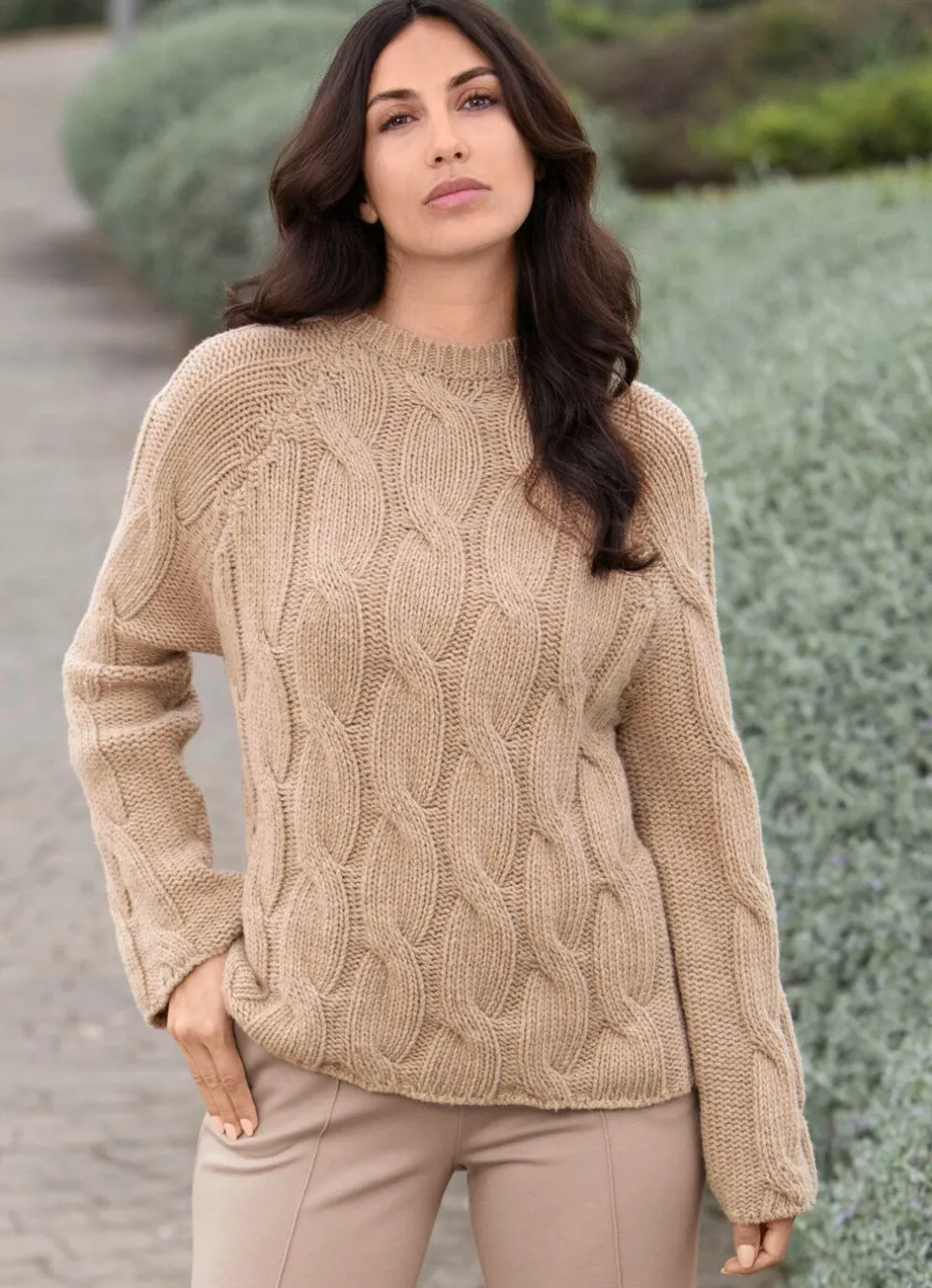 Herrlicher Pullover von TIZIA mit Zopfmuster allover, geripptem, rundem Halsausschnitt sowie langen Raglanärmeln.