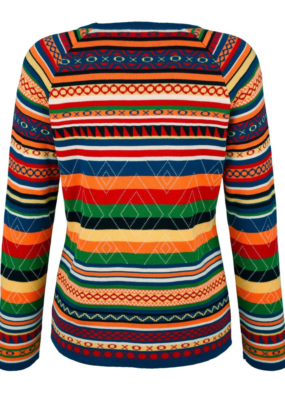 Pullover mit rundem Halsausschnitt, langen Raglanärmeln sowie farbenfrohem Mustermix in Ringeldessin allover. Länge ab ca. 64 cm. Jacquard aus 50% Baumwolle, 50% Polyacryl