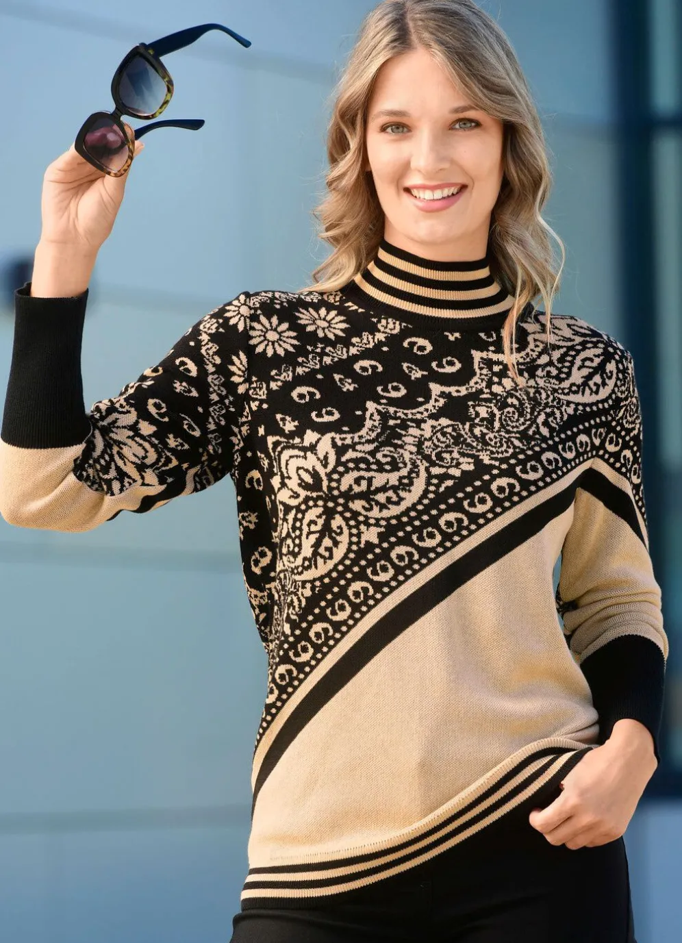 Ein extravaganter Modebegleiter ist dieser Pullover mit geringeltem Stehbund, Mustermix allover, geripptem, geringeltem Saumabschluss sowie langen Ärmeln mit hohem, kontrastfarbenem Rippenbund.
