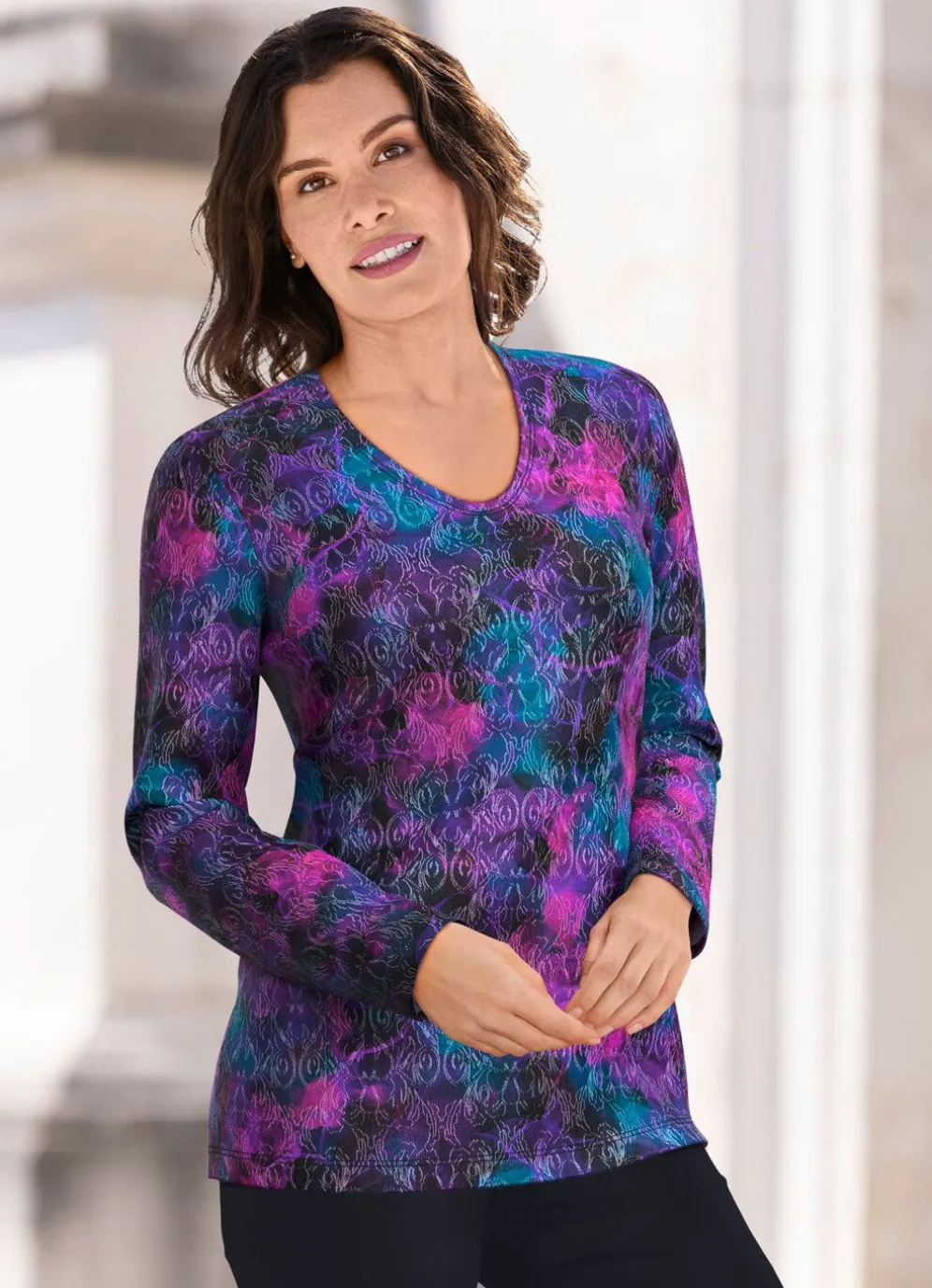 Jedes Teil ein Unikat! Pullover mit farbbrillantem Alloverdruck in Magenta-Blau-Multicolor, legerem V-Ausschnitt sowie langen Ärmeln.
