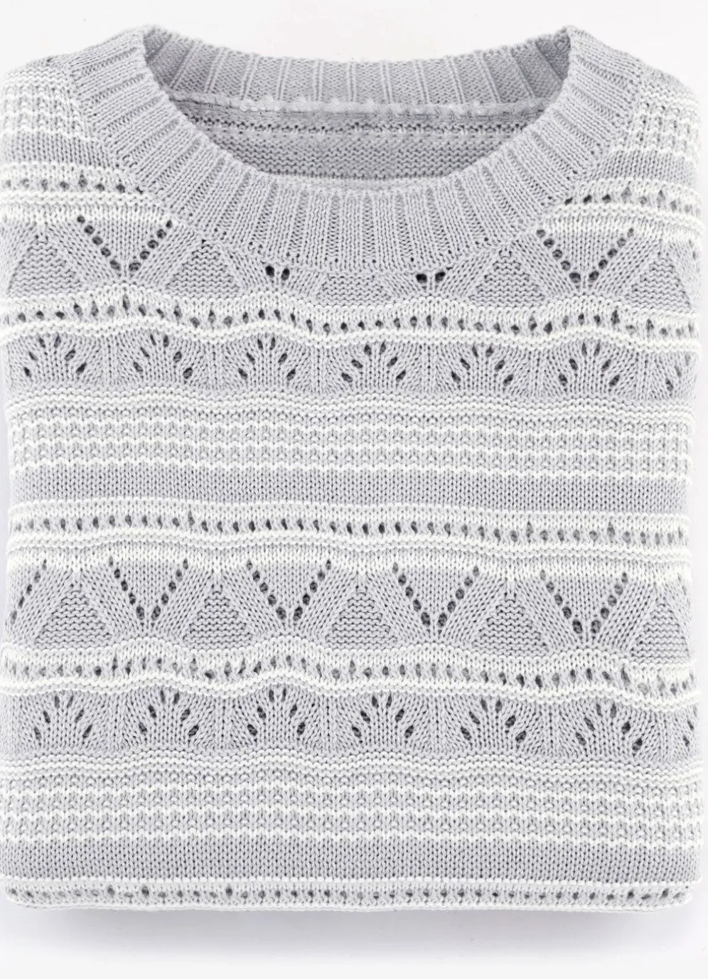 Aparter Pullover mit raffiniertem Struktur- und Ajourmustermix allover, rundem Halsausschnitt, 3/4-langen Ärmeln sowie Rippenbündchen an den Abschlüssen.