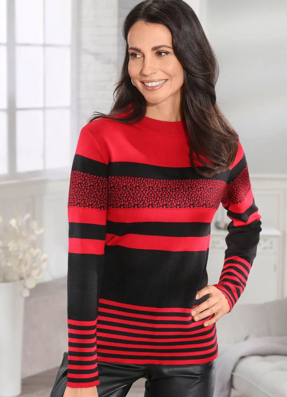 Aparter Pullover mit Mustermix in Streifenoptik allover, geripptem Stehbund sowie breitem Rippenbund an den langen Ärmeln und am Saum.