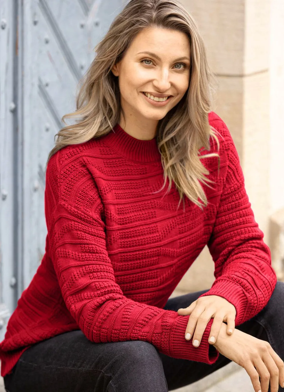 Ansprechender Pullover mit Stehbund, aufwendigem Strukturmix im Ringeldessin allover, überschnittener Schulterpartie, langen Ärmeln sowie gerippten Abschlüssen.